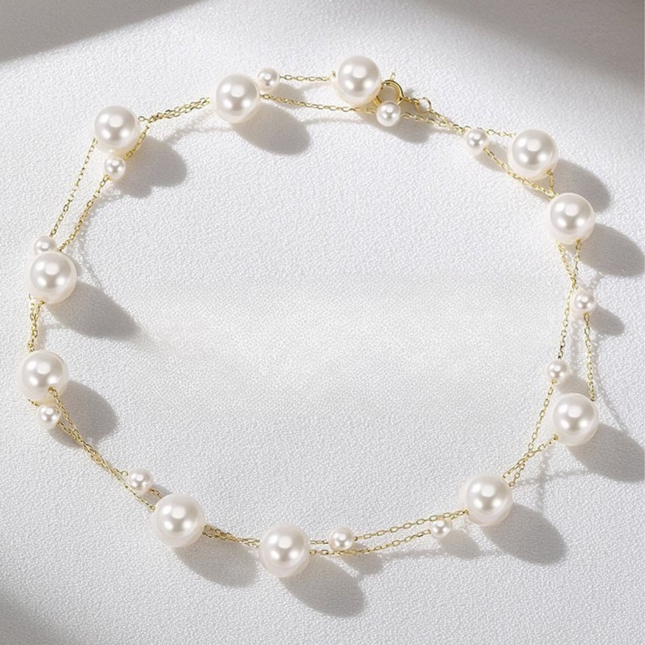 繊細なゴールドチェーンに、つやめくパールを丁寧にあしらったY字ネックレス。