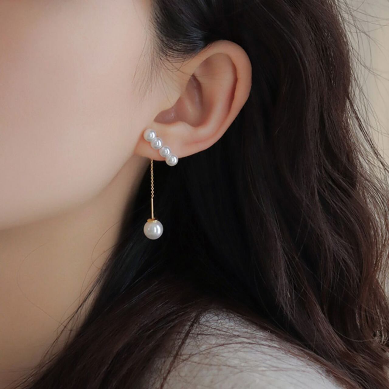 小粒パールが耳元をすっと彩り、大粒パールが揺れる華やかな2WAY風デザインピアス。