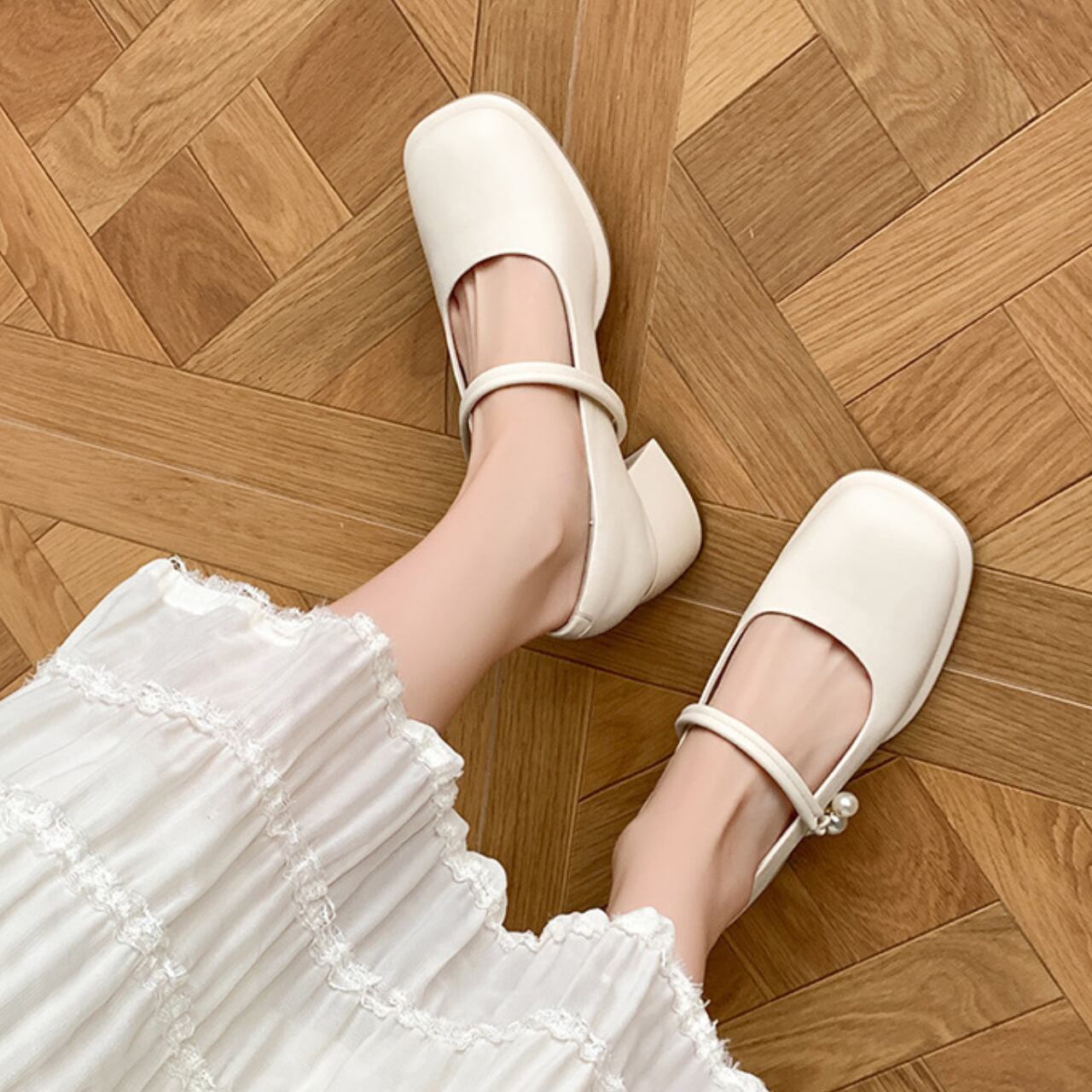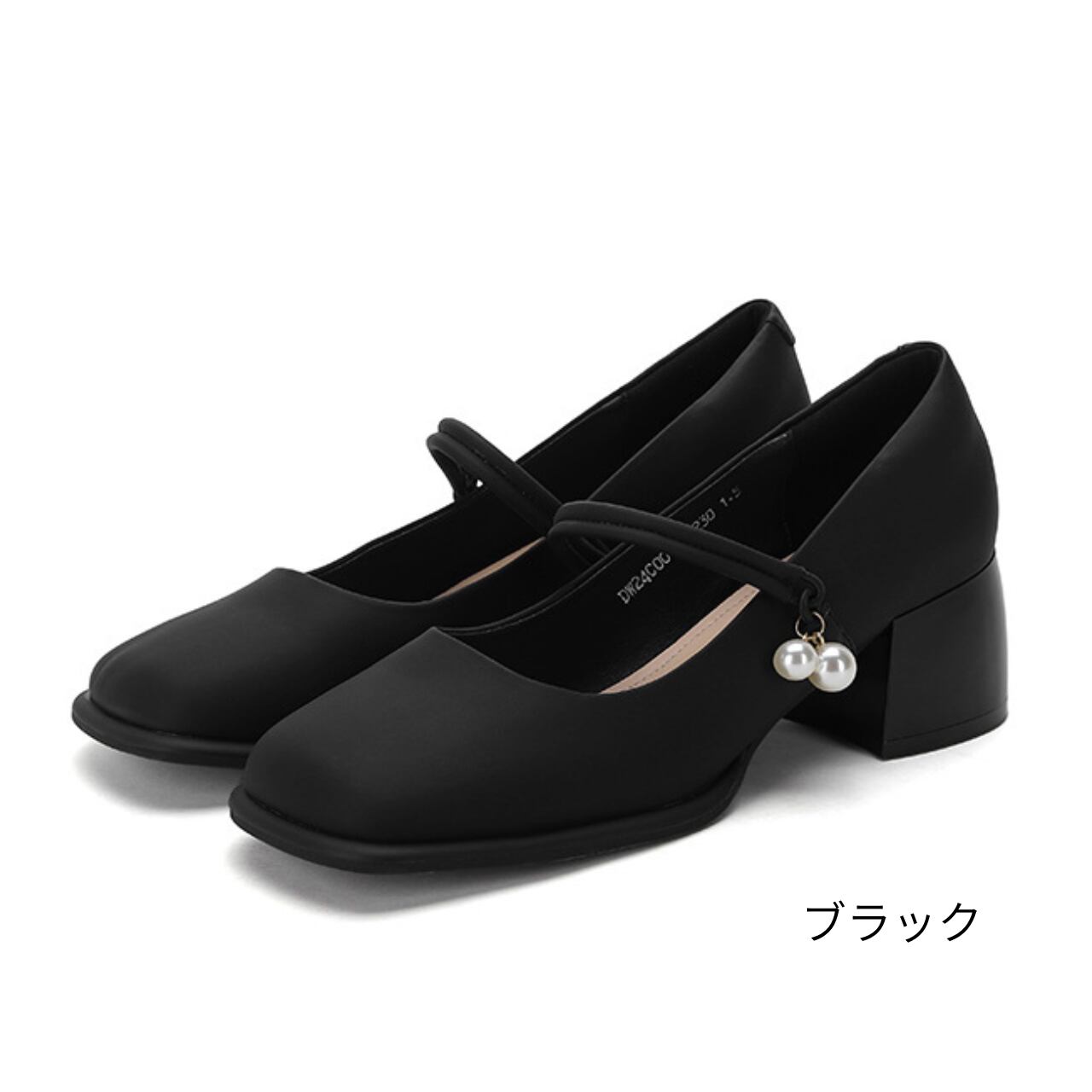 ころんとした丸みのあるフォルムに、パールボタン付きストラップが愛らしいレトロパンプス。