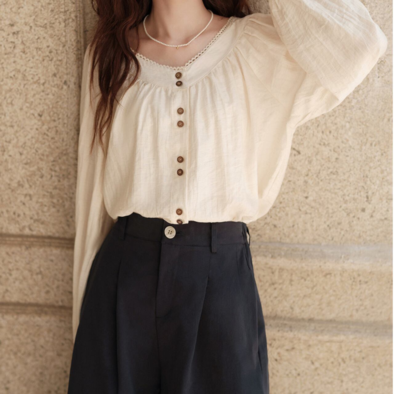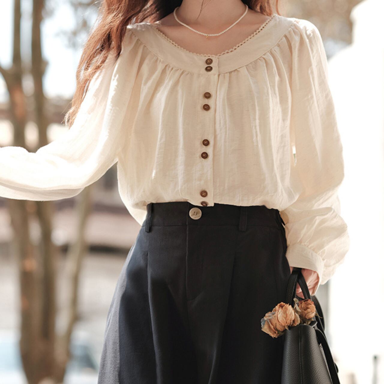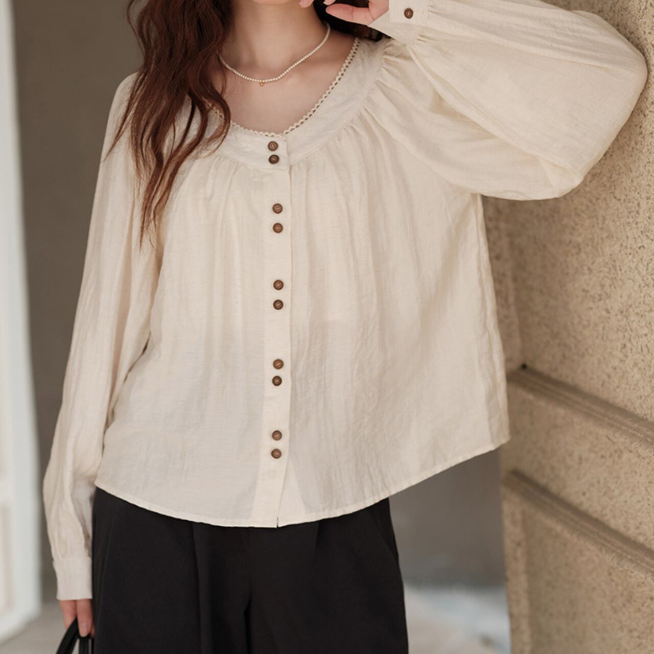 やわらかなクリームカラーに、ウッド調のボタンがナチュラルなアクセントを添えるブラウス。