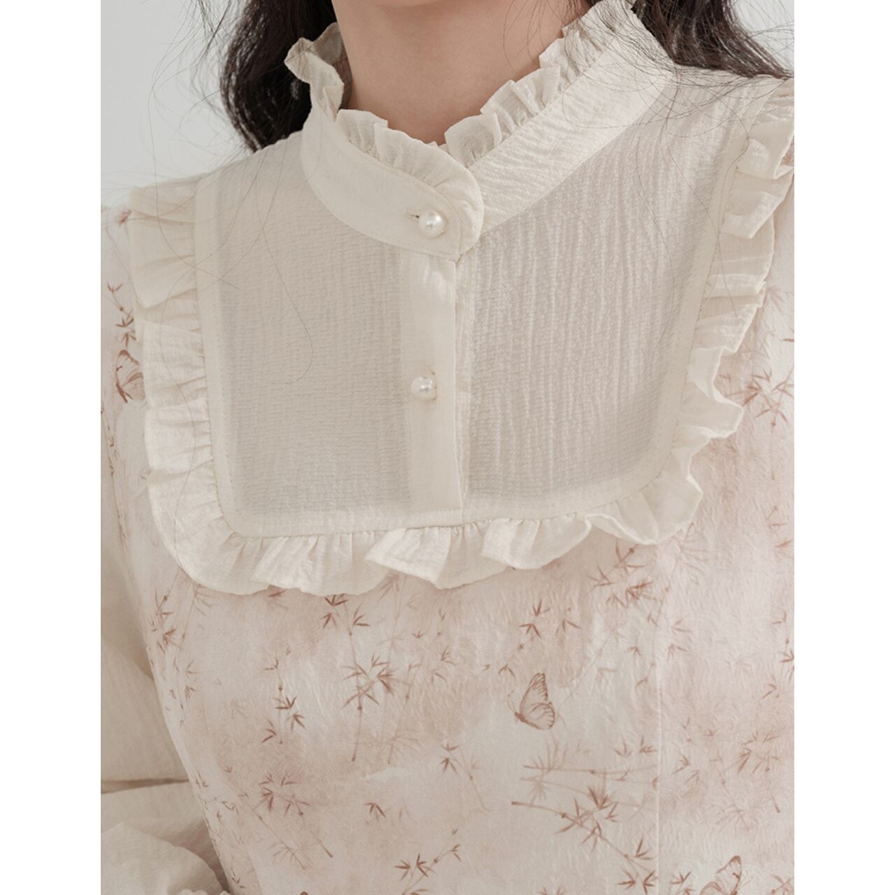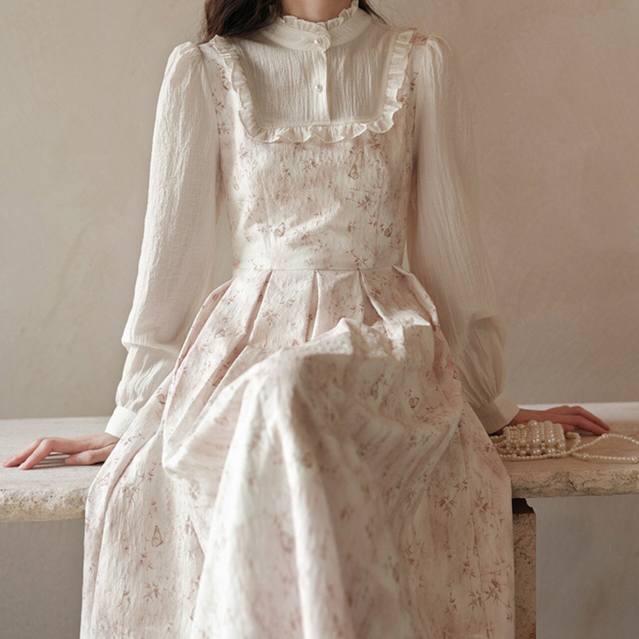 繊細な小花柄ジャンパースカートと、フリル襟のブラウスを重ねたレイヤード風ワンピース。