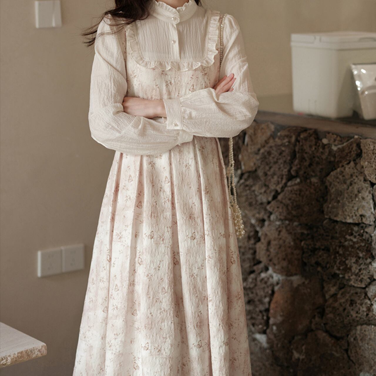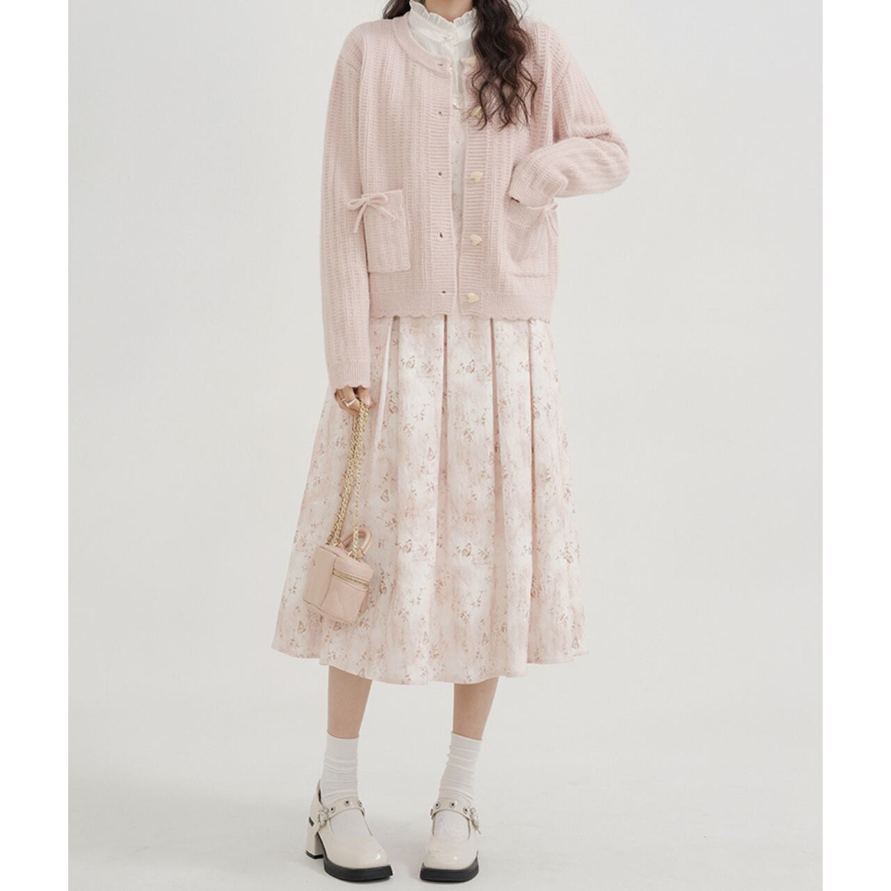 淡いピンクベージュの花柄が優しく、上品な可愛らしさを引き立てます。