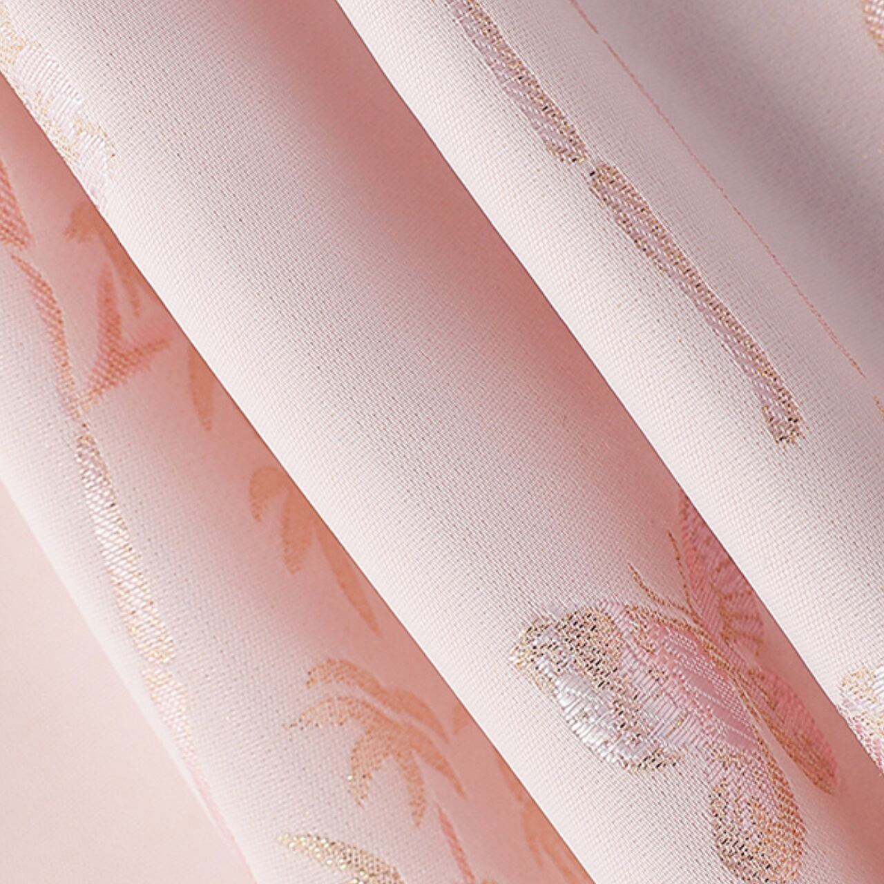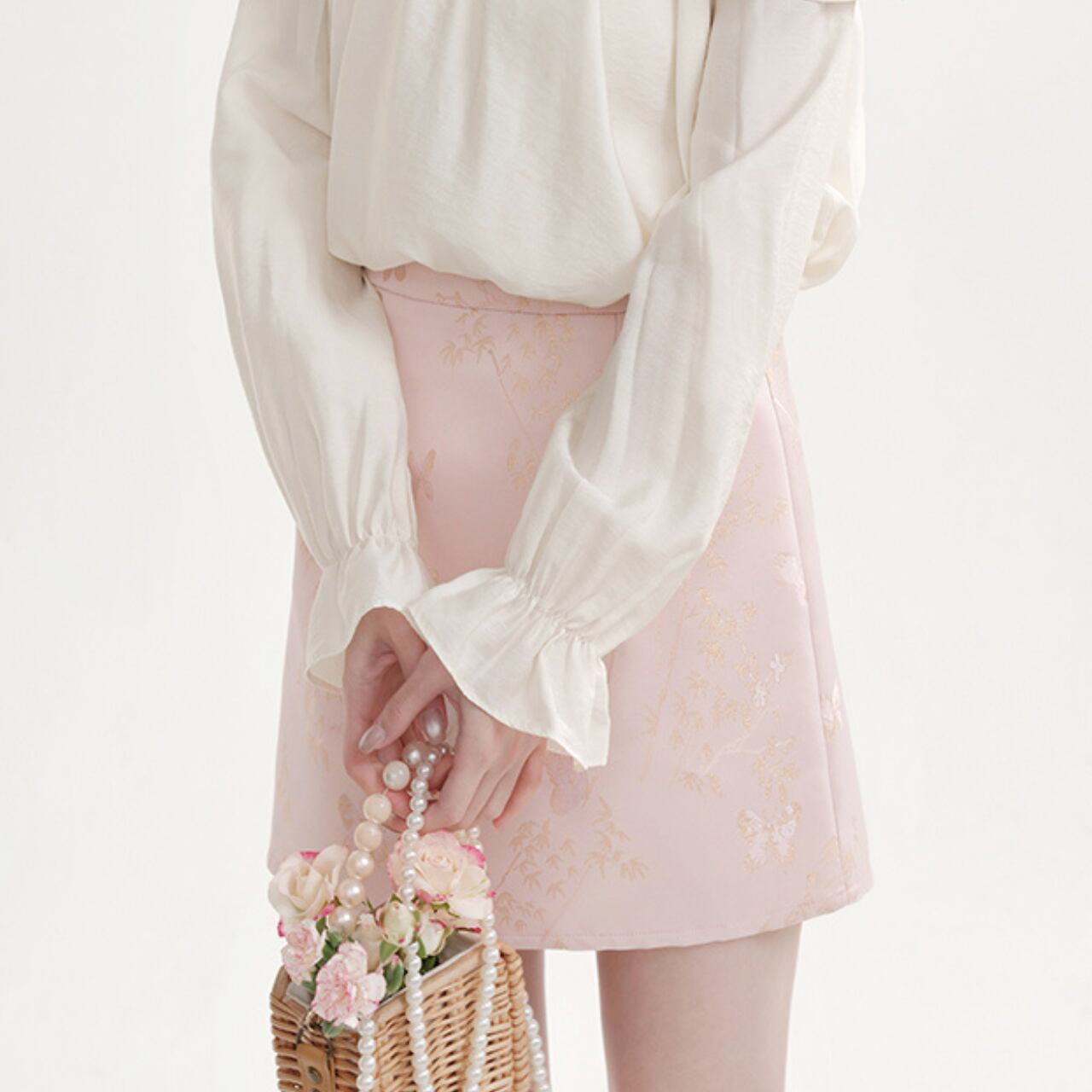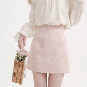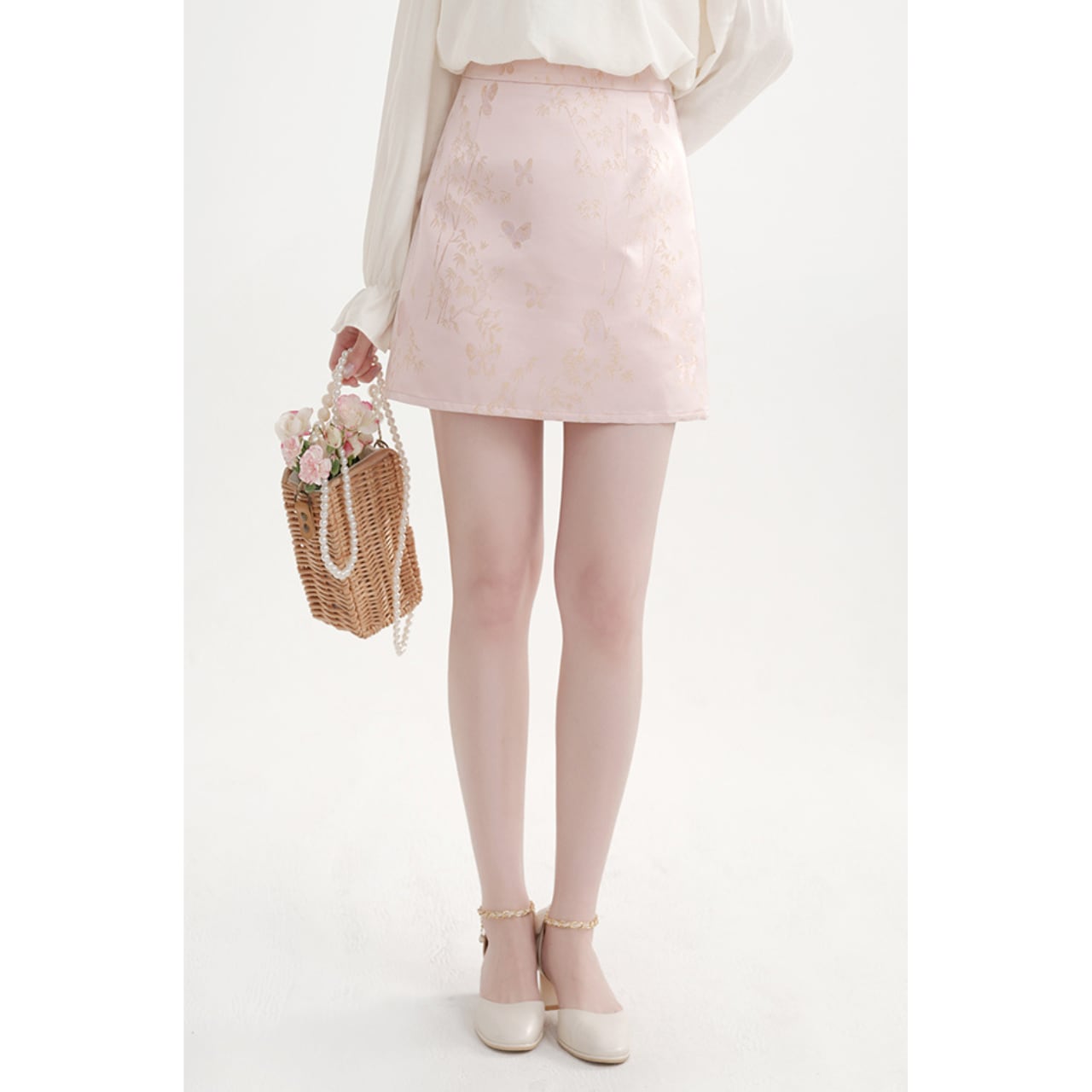 淡いピンクに蝶や草花のジャカード柄を織り込んだ、愛らしいミニスカート。