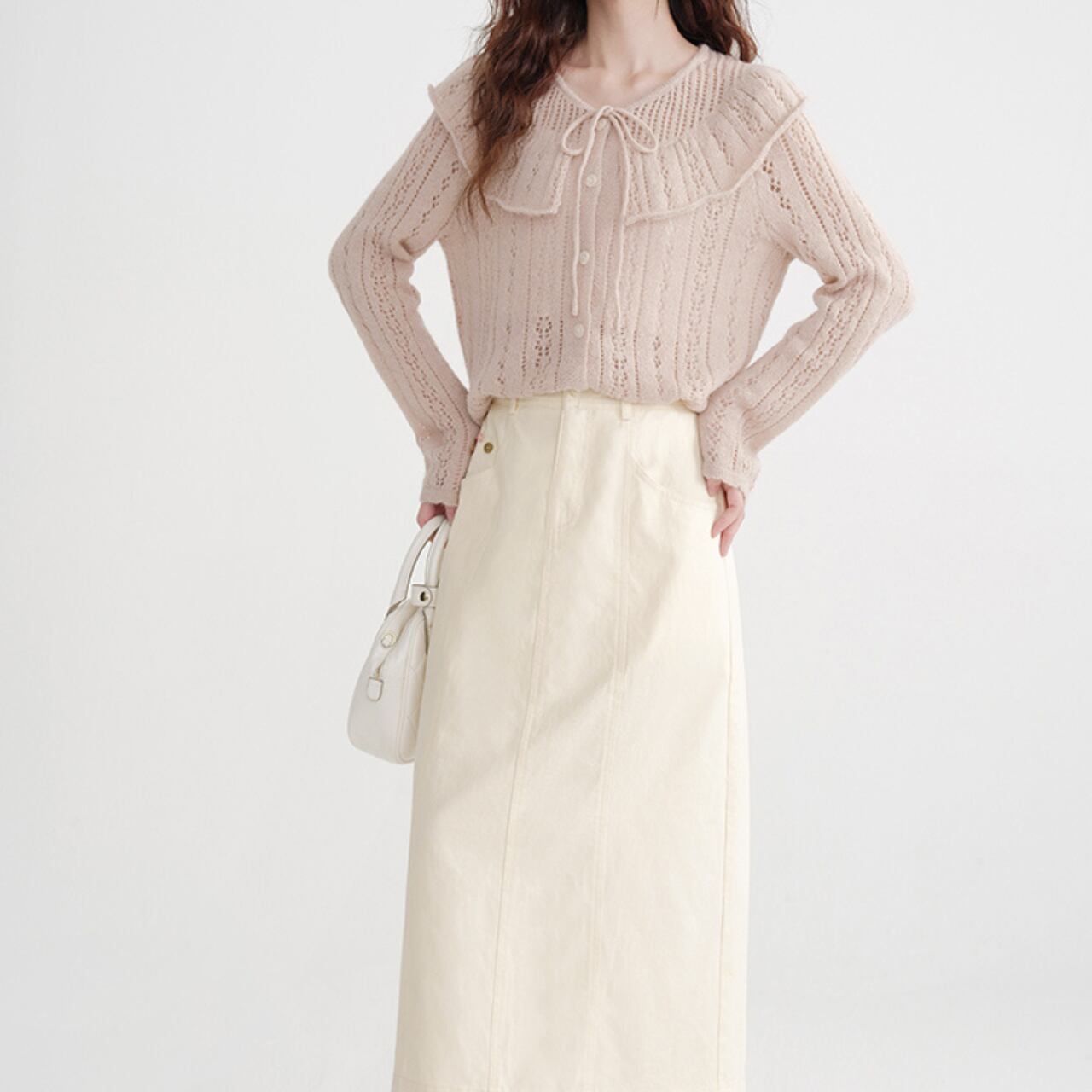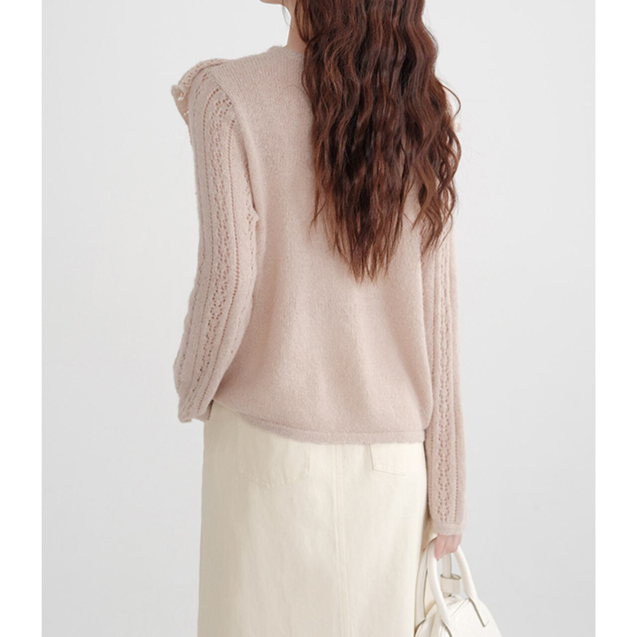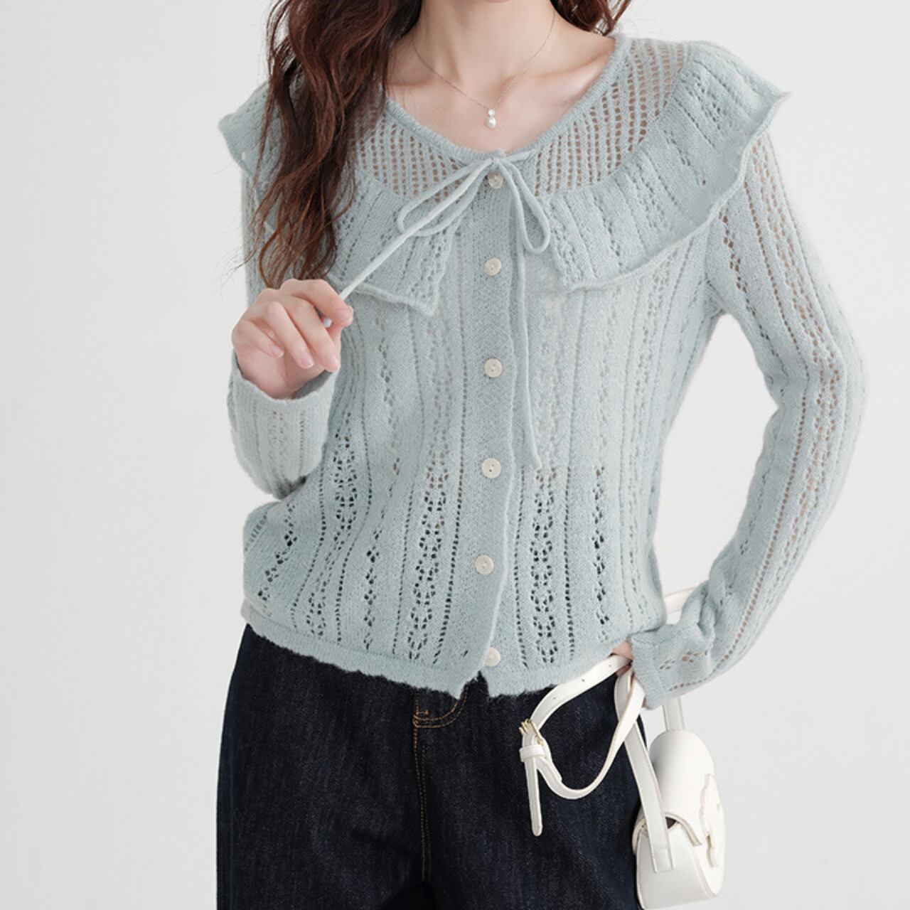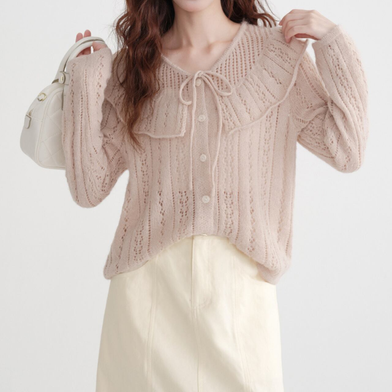 繊細な透かし編みとフリル付きの襟が愛らしい、リボンタイ付きニットカーディガン。