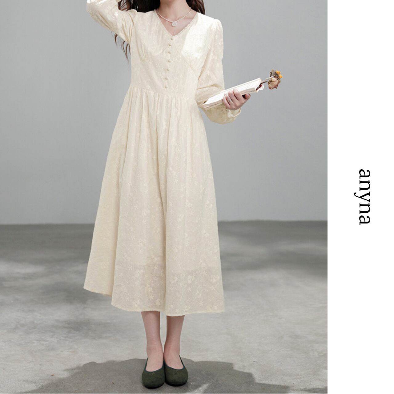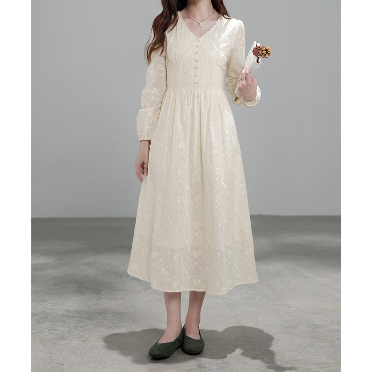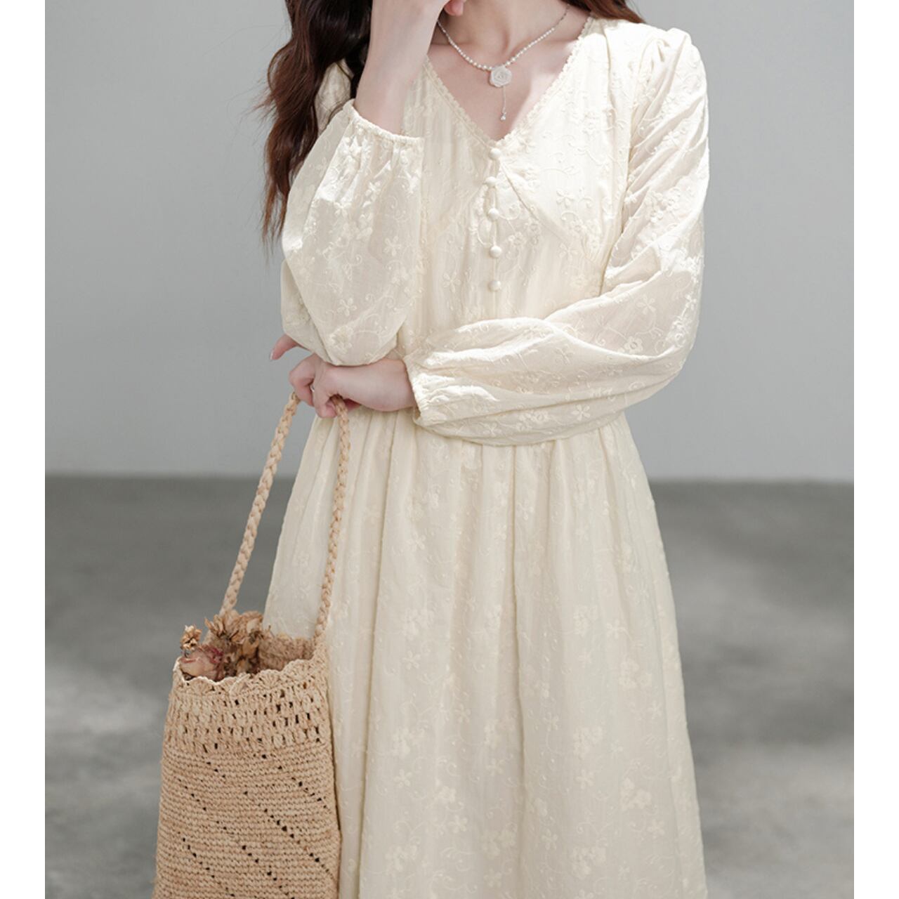上品なアイボリーカラーに、繊細なフラワージャカードをあしらったロングワンピース。