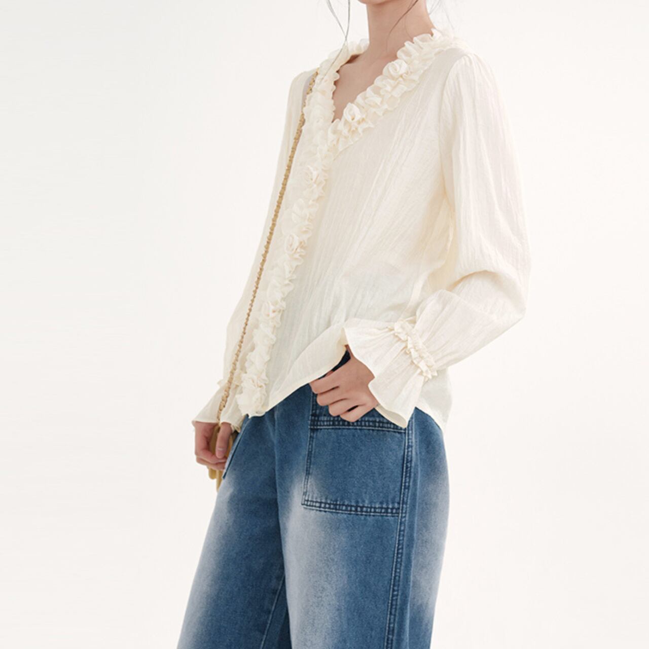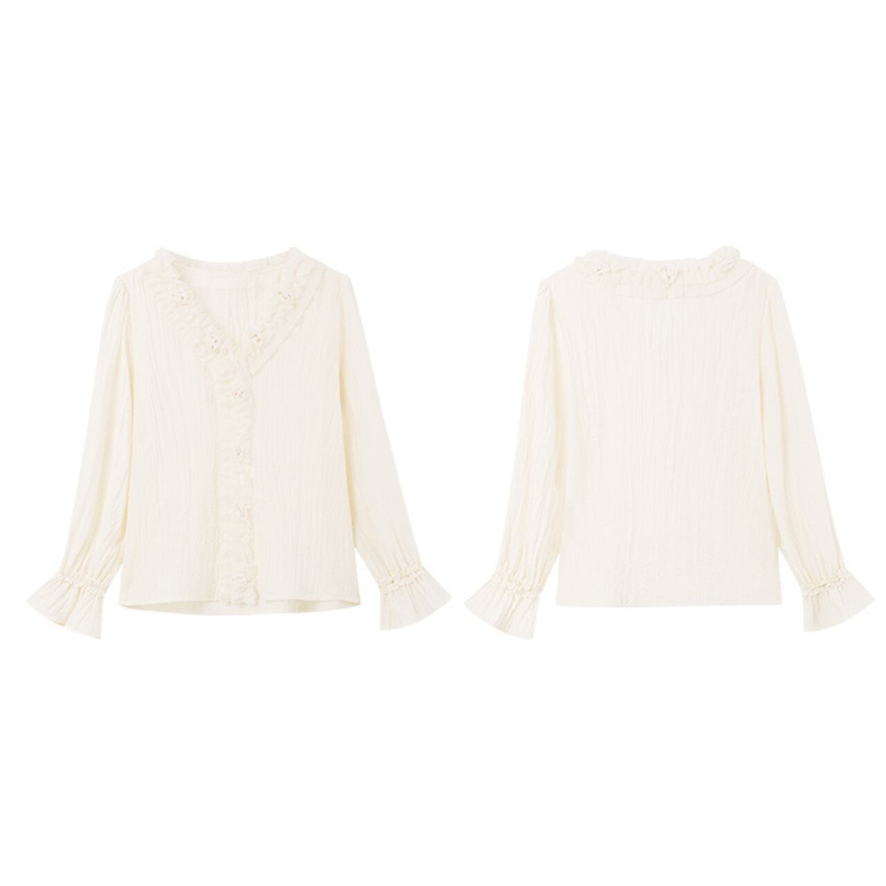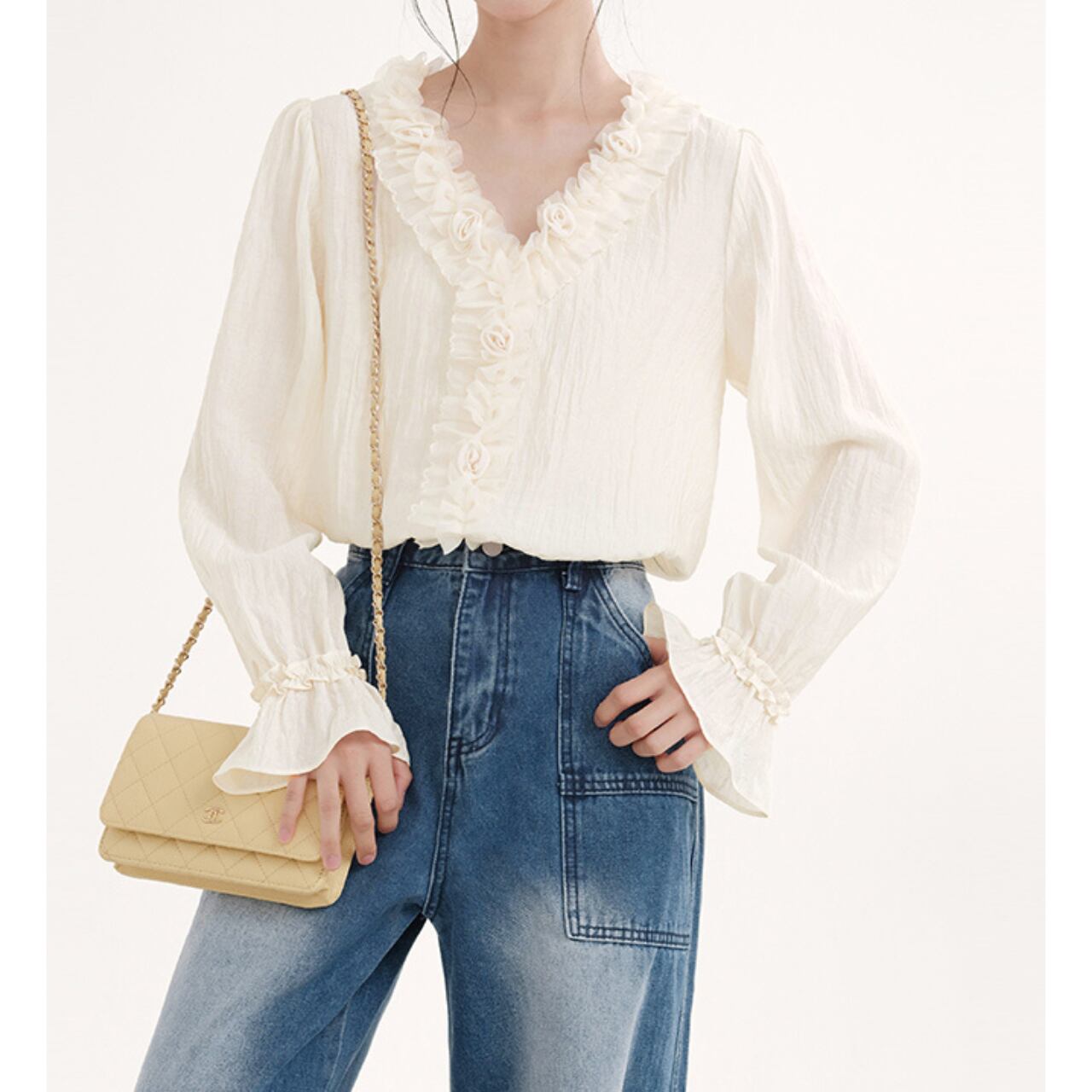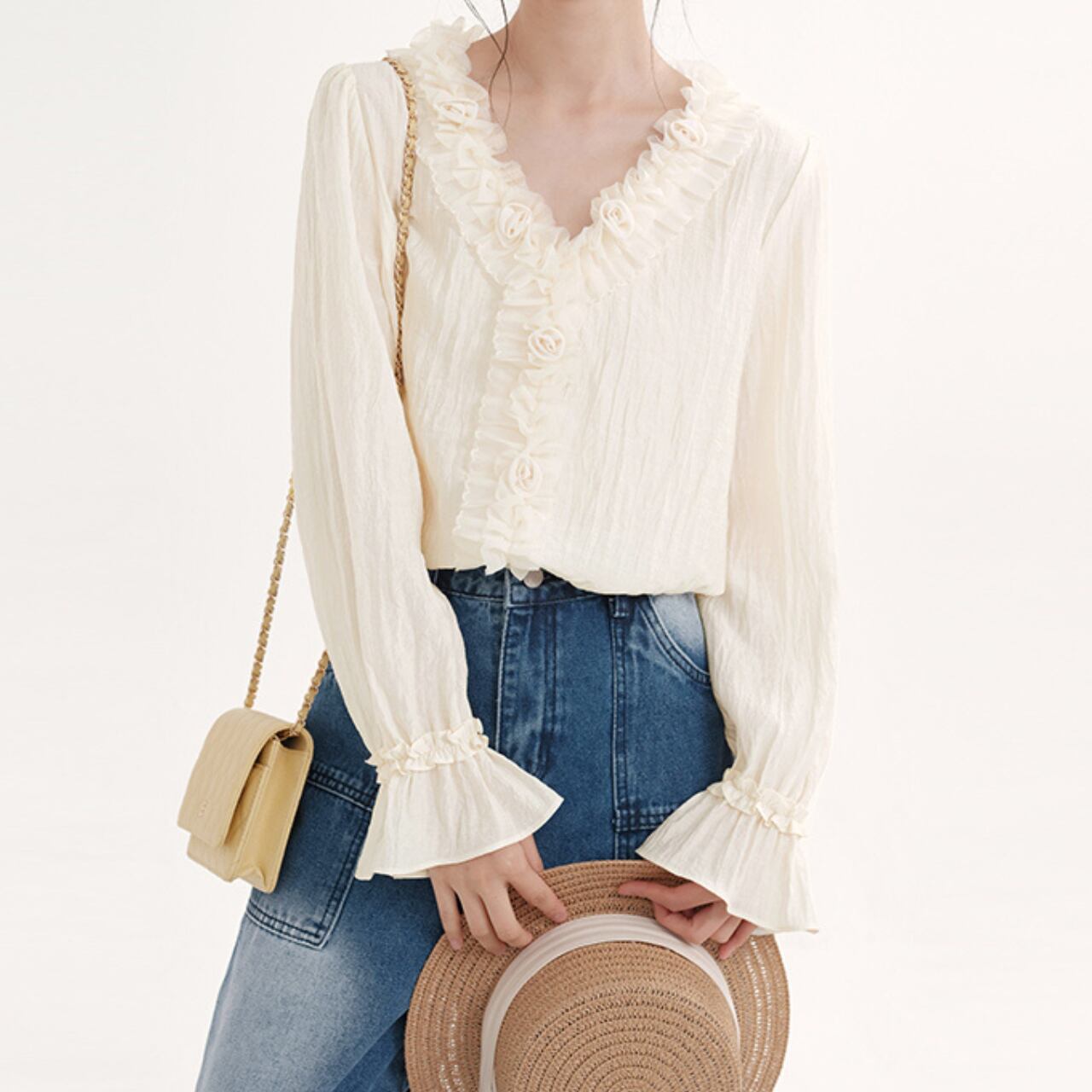 フロントに施された立体的なお花ボタンとフリルが華やかなブラウス。