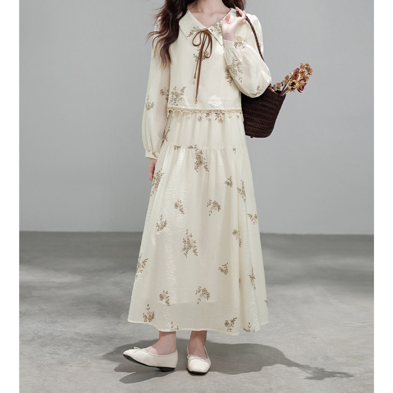 淡いアイボリー地にブラウンの小花柄をあしらった、ナチュラルフェミニンなセットアップ。