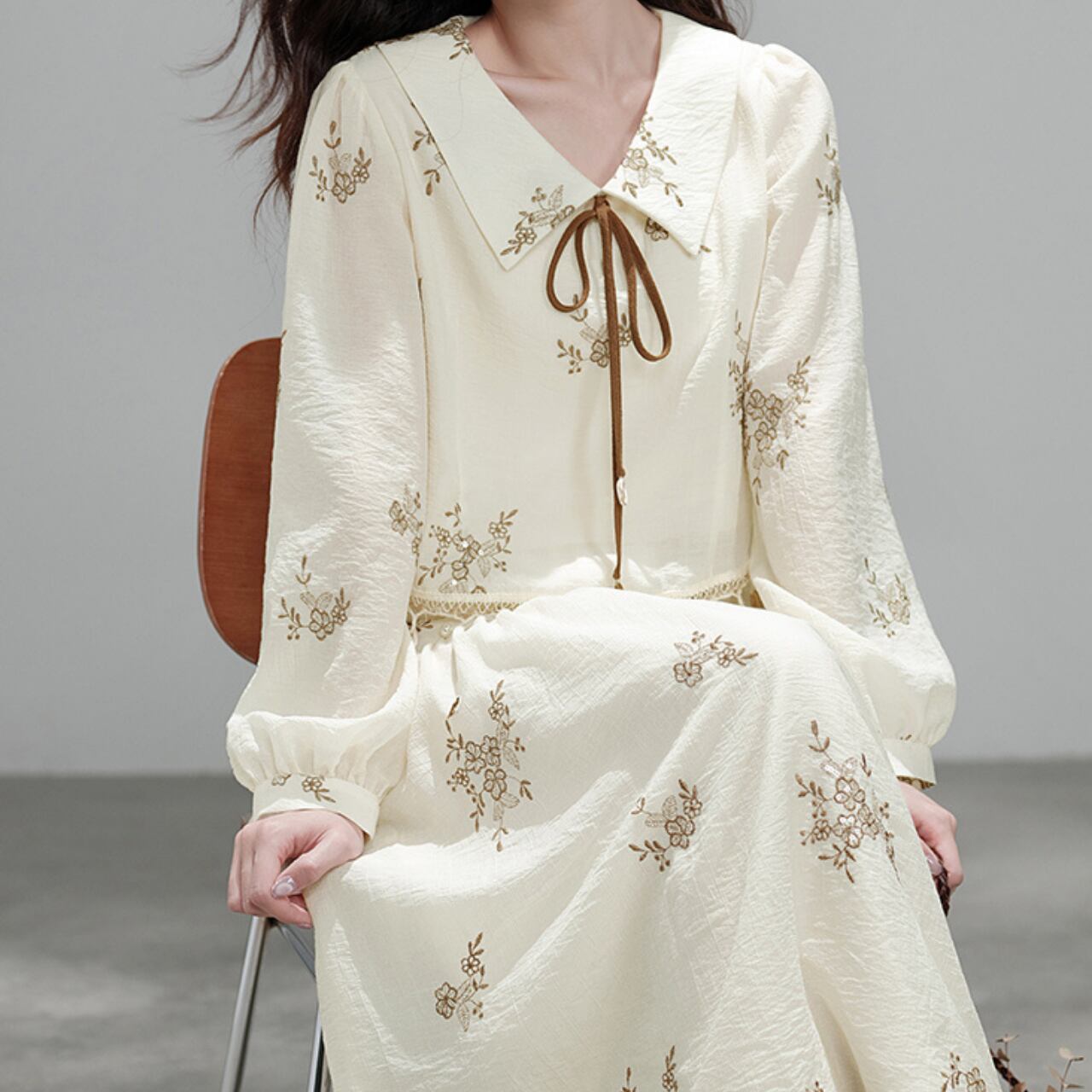 トップスは大きめのセーラーカラーに細リボンを添えて、可愛らしさと大人っぽさを両立。