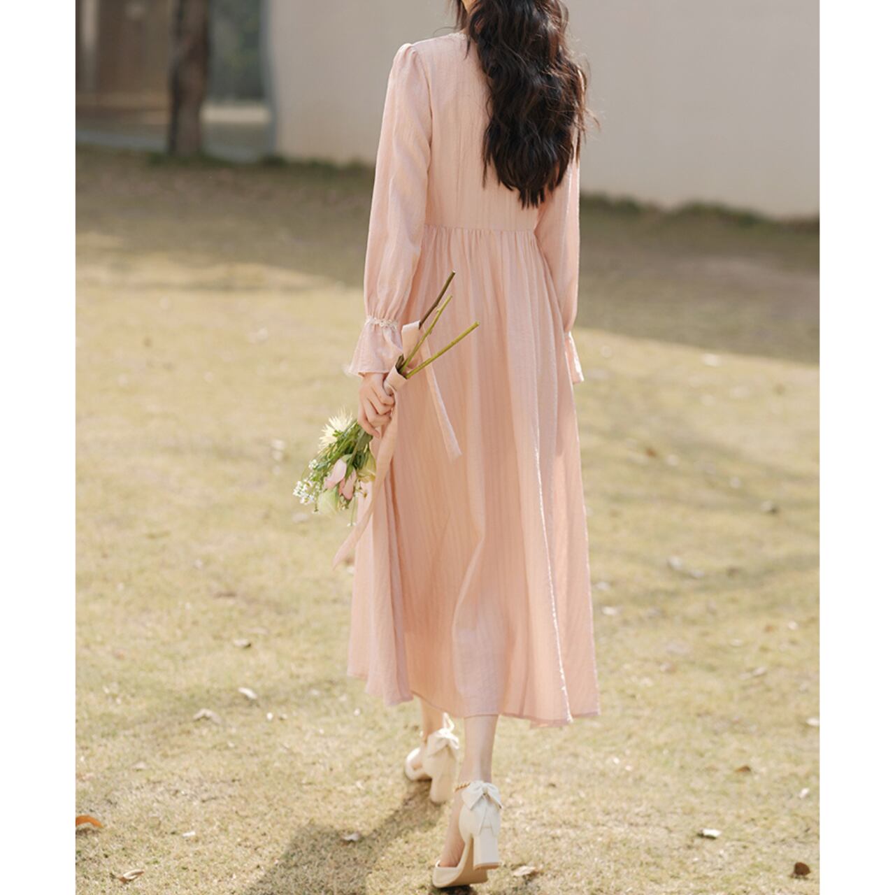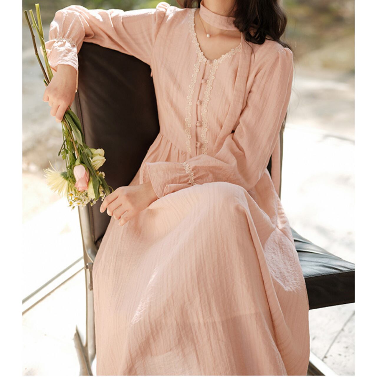 やわらかなピンクカラーに繊細なレースをあしらった、フェミニンなロングワンピース。