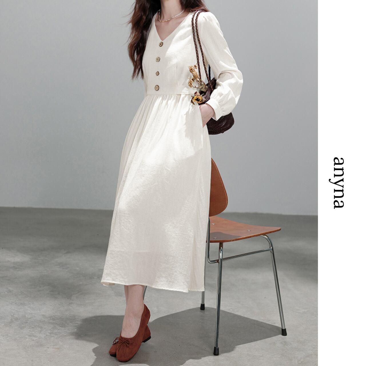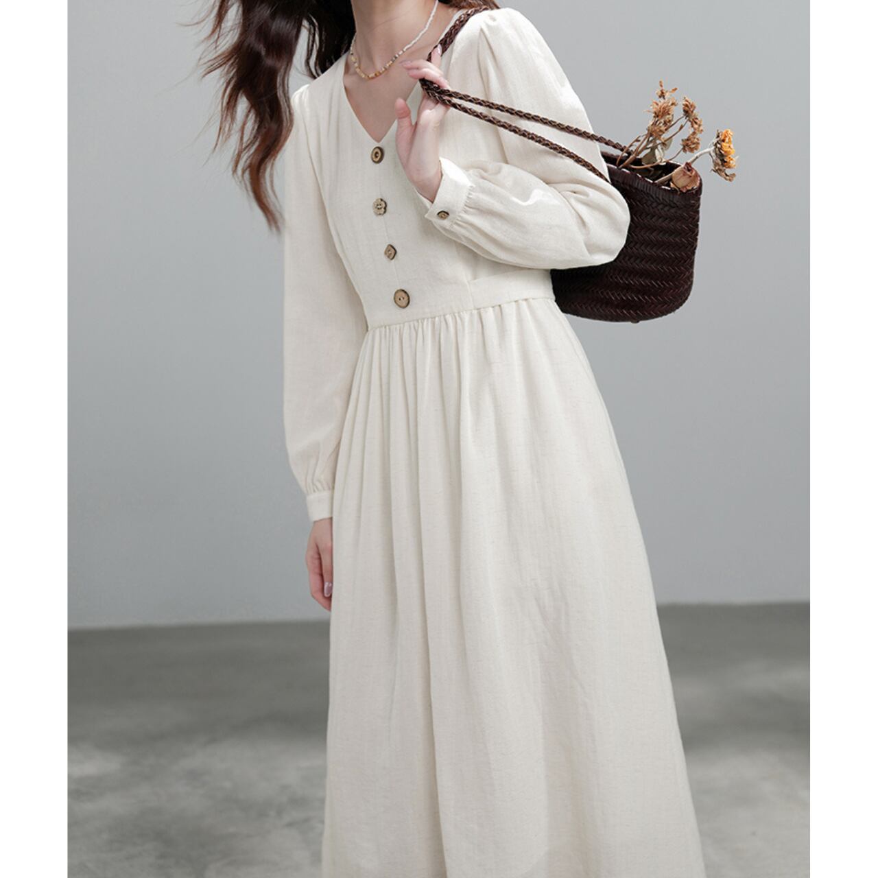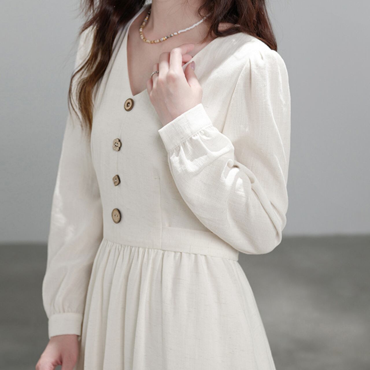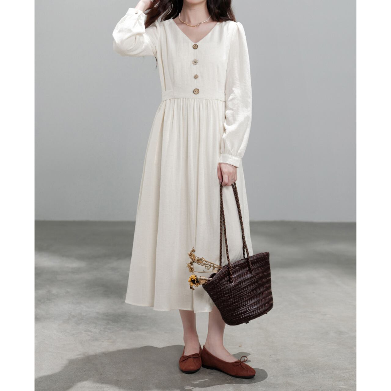 ナチュラルな生成りカラーにウッド調ボタンをあしらった、シンプルフェミニンなワンピース。