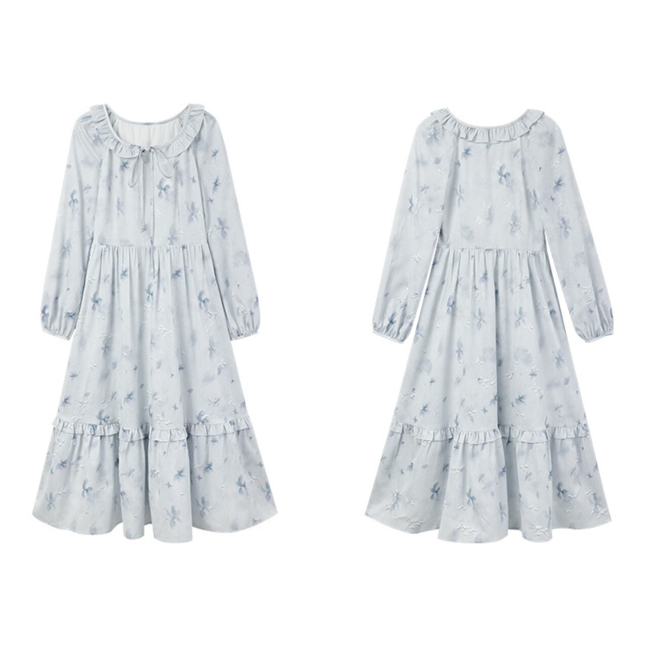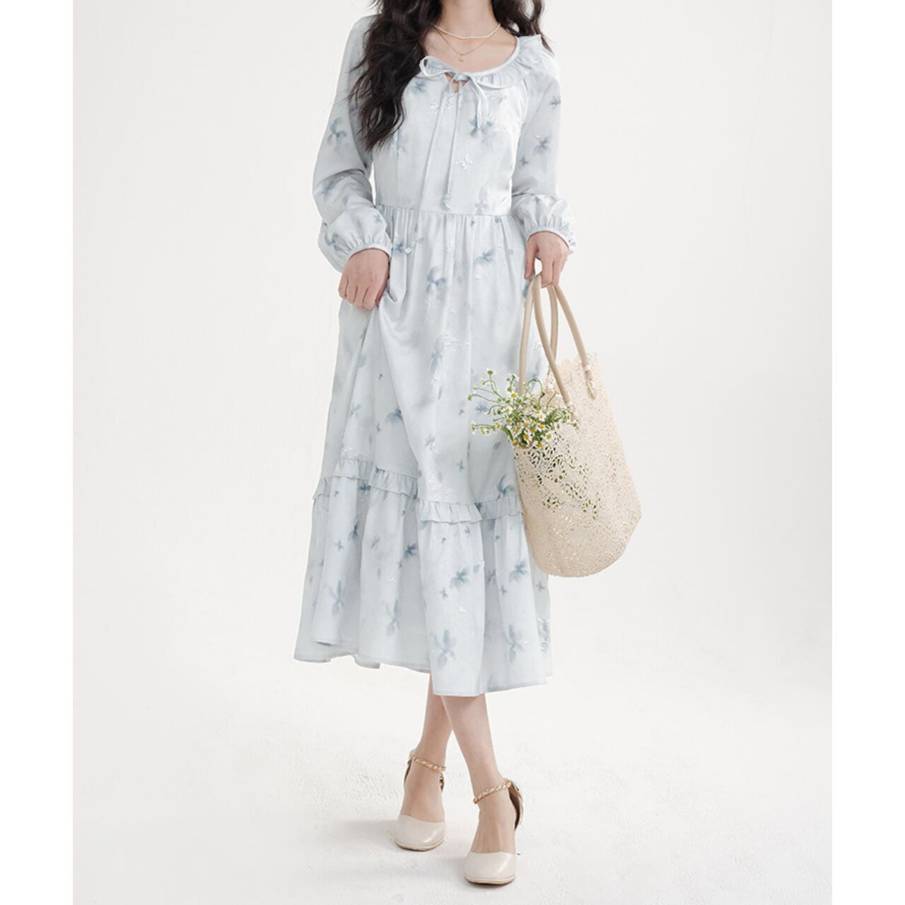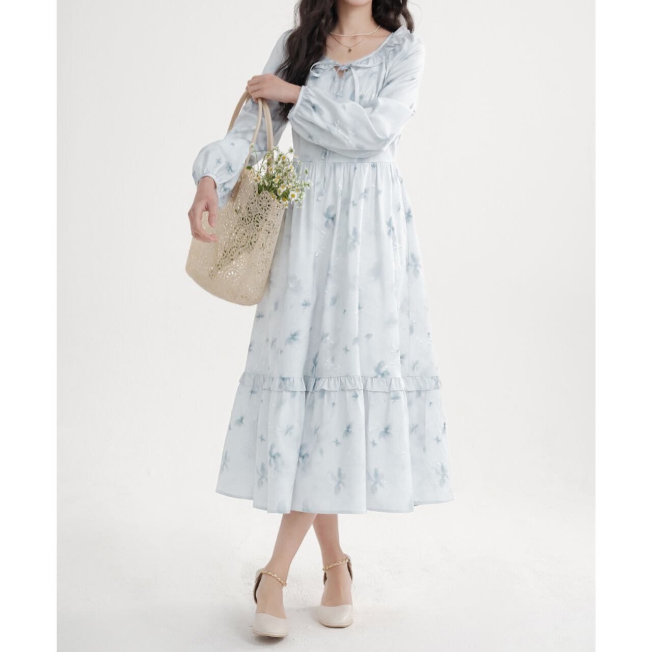 淡いブルーに花模様をあしらった、やさしい雰囲気のティアードワンピース。