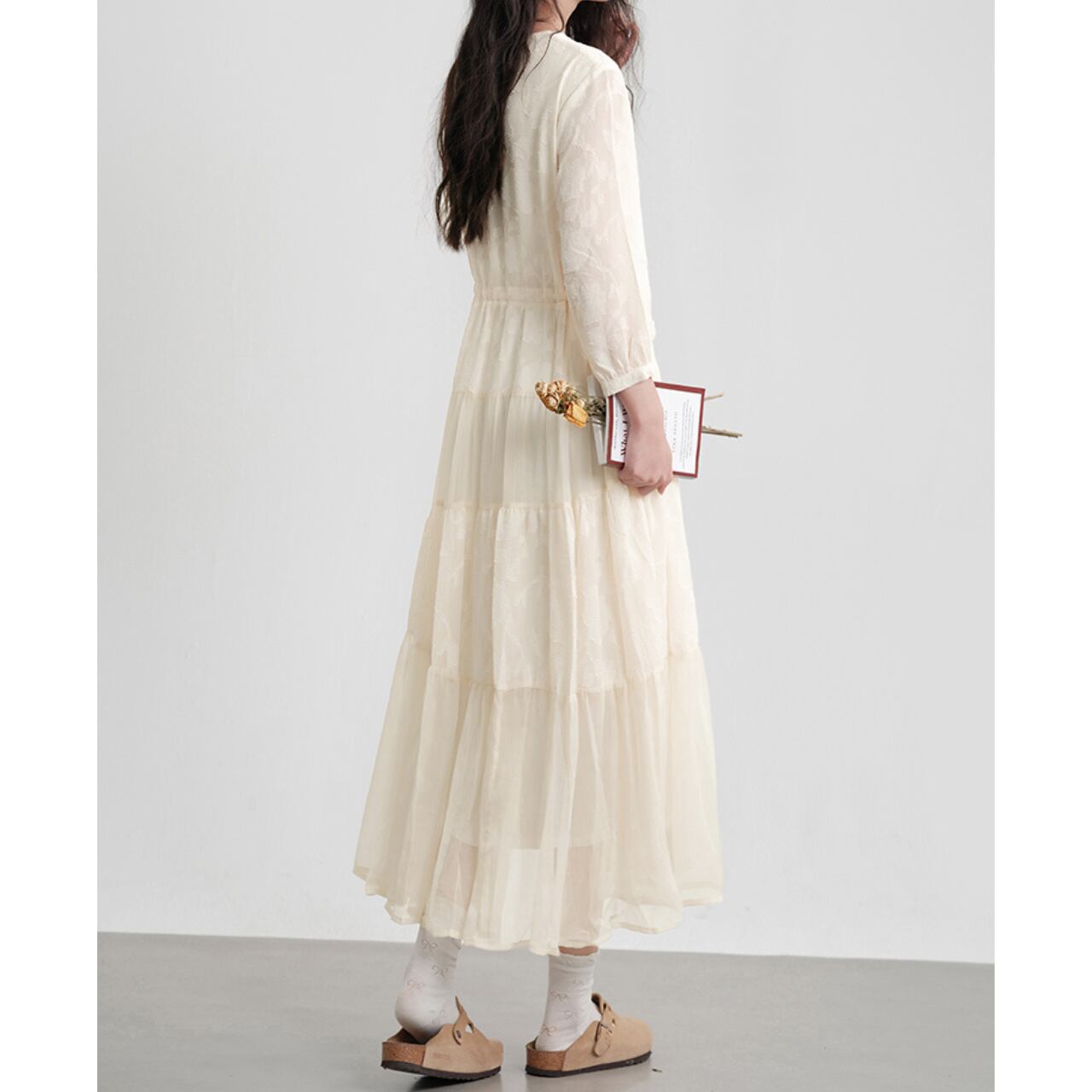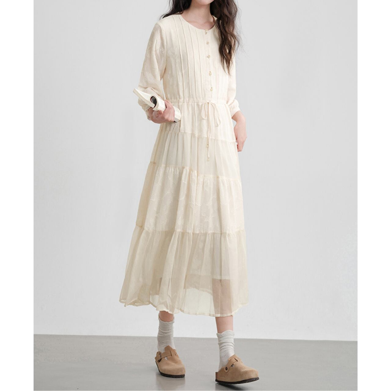 透け感のある軽やかな生地を重ねた、やさしい雰囲気のロングワンピース。