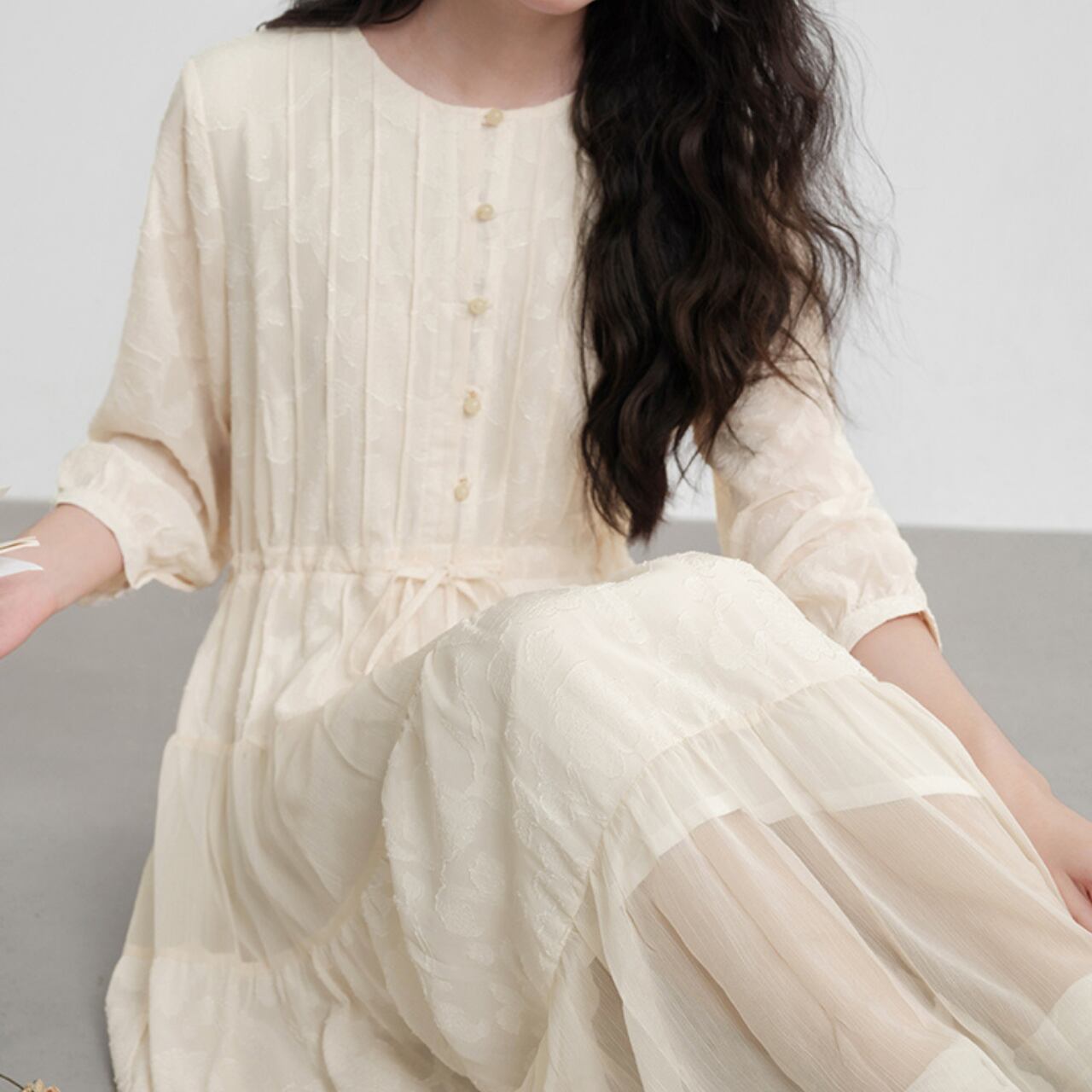 ピンタックと小さなボタンが繊細なアクセントになり、ふんわり広がるシルエットがフェミニンさを引き立てます。