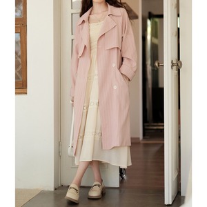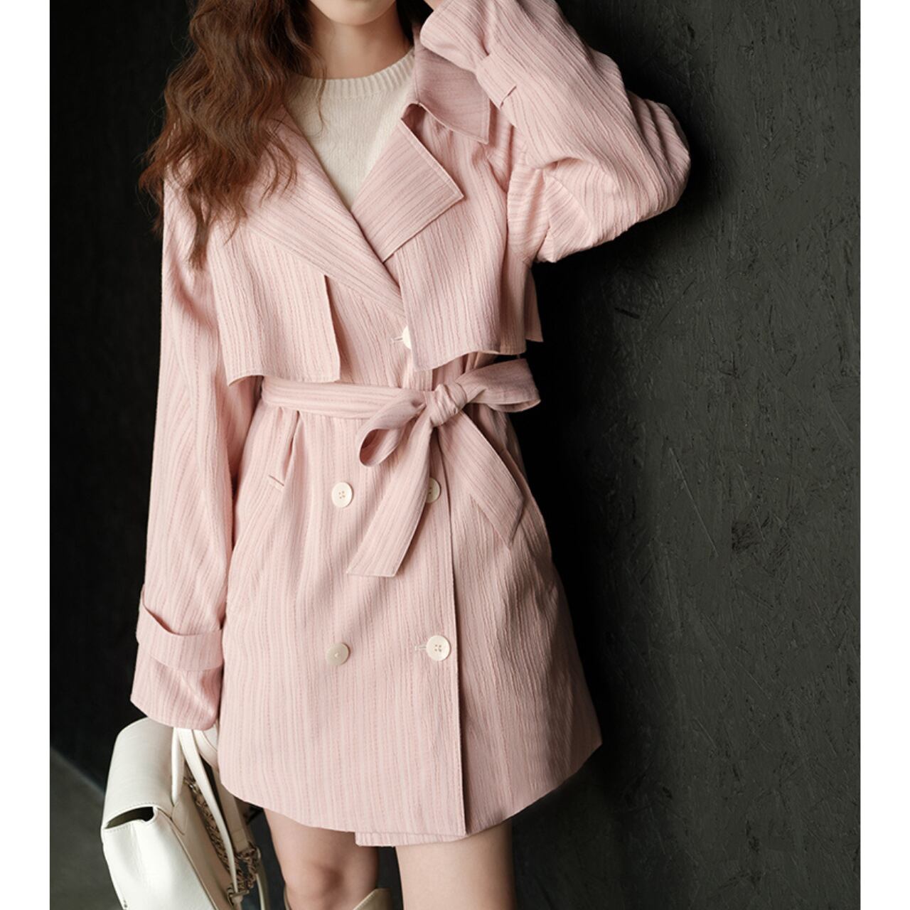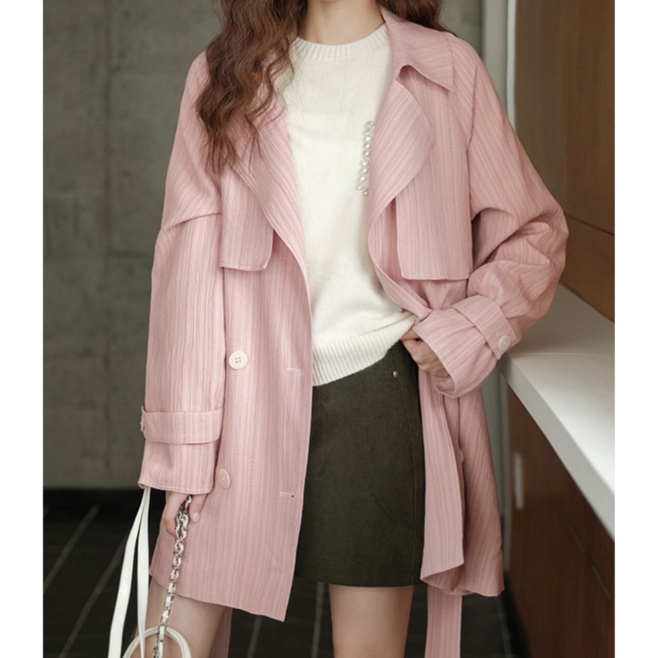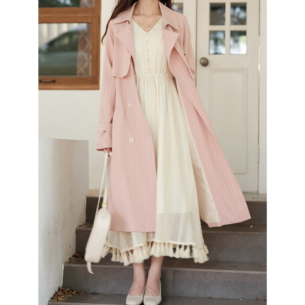 やわらかなピンクカラーが女性らしさを引き立てるトレンチコート。