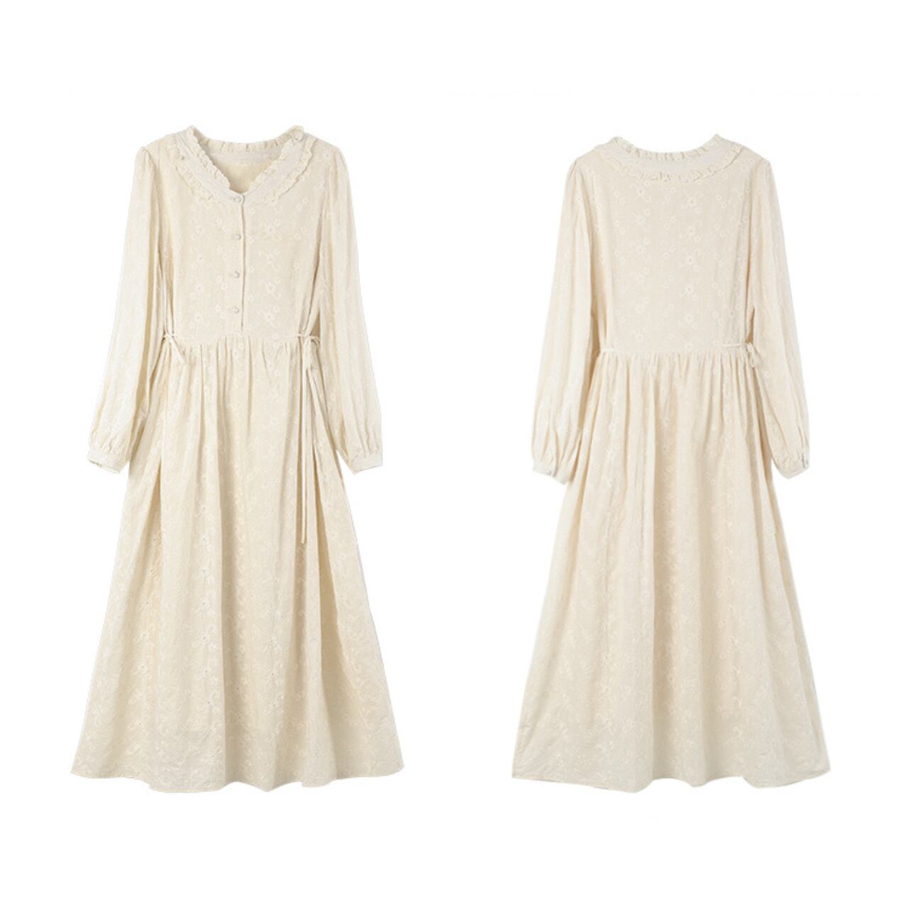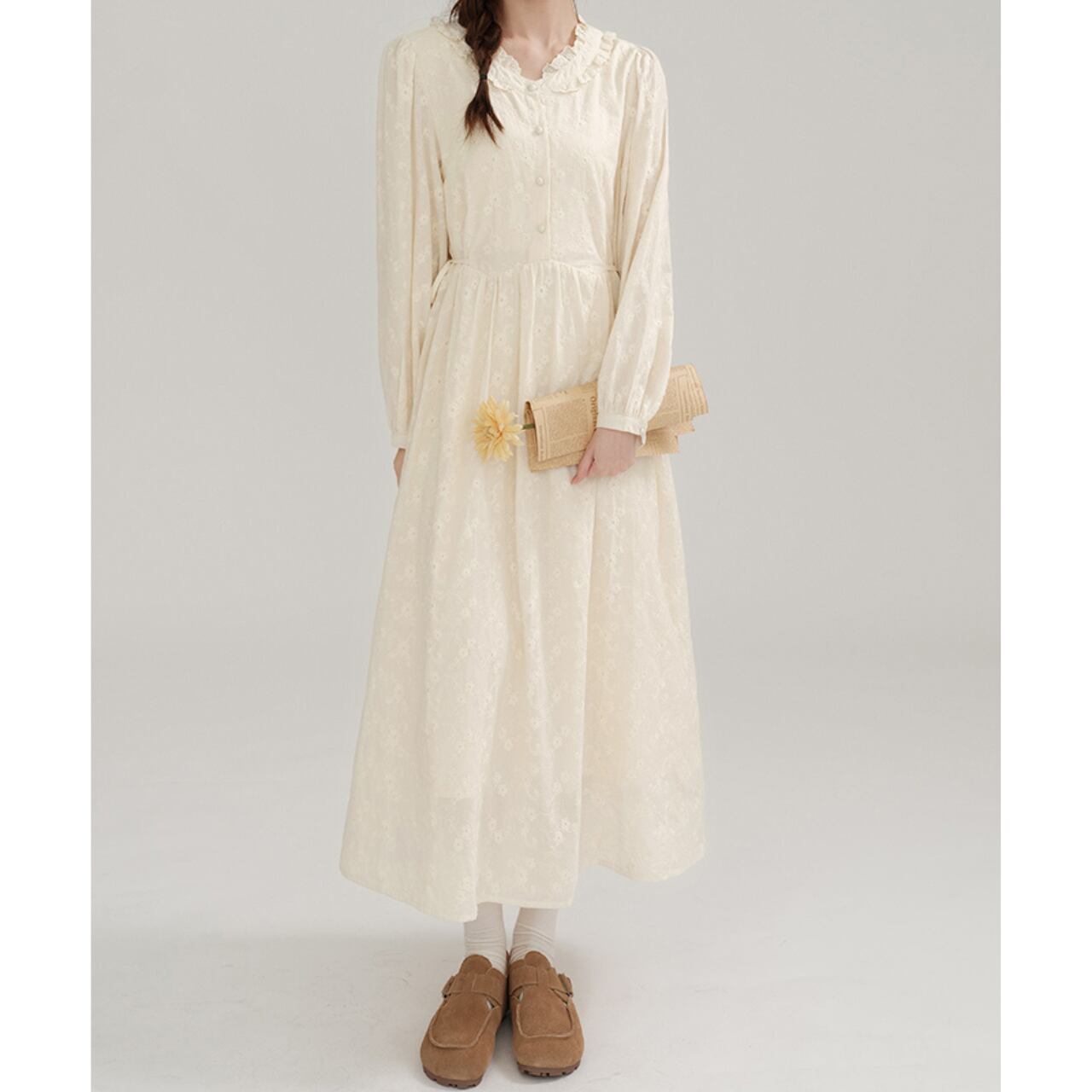 やわらかなクリームカラーに繊細なお花模様をあしらったロングワンピース。