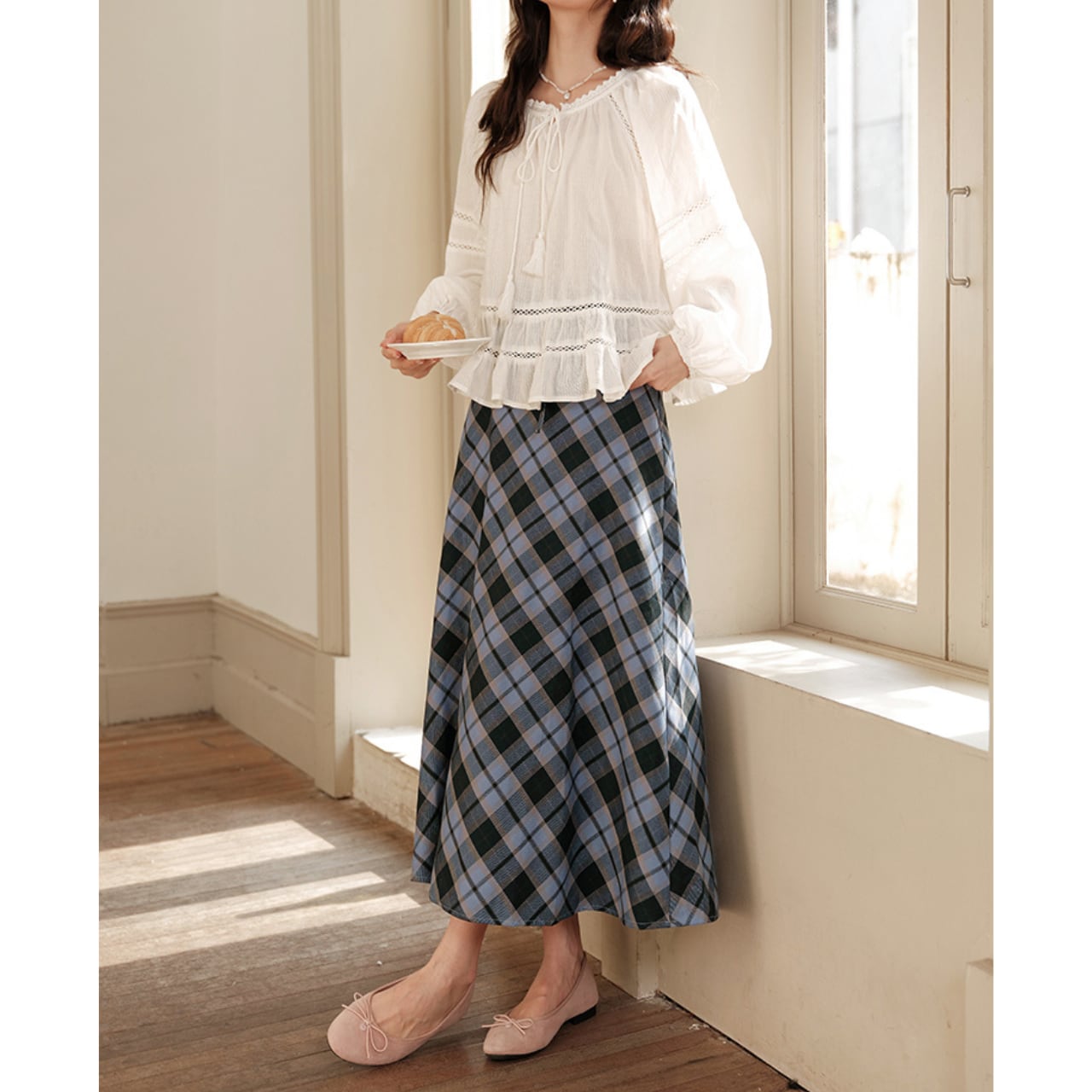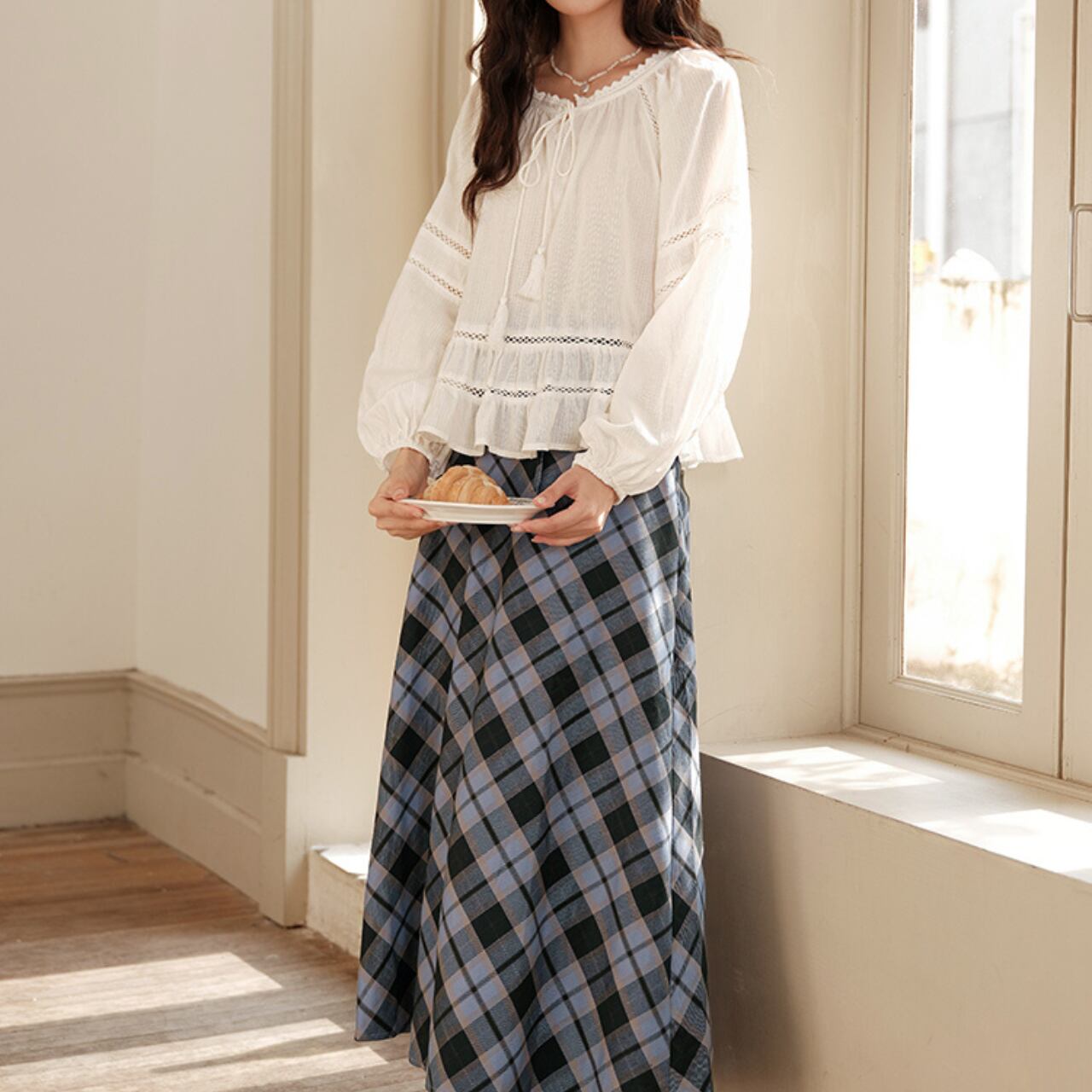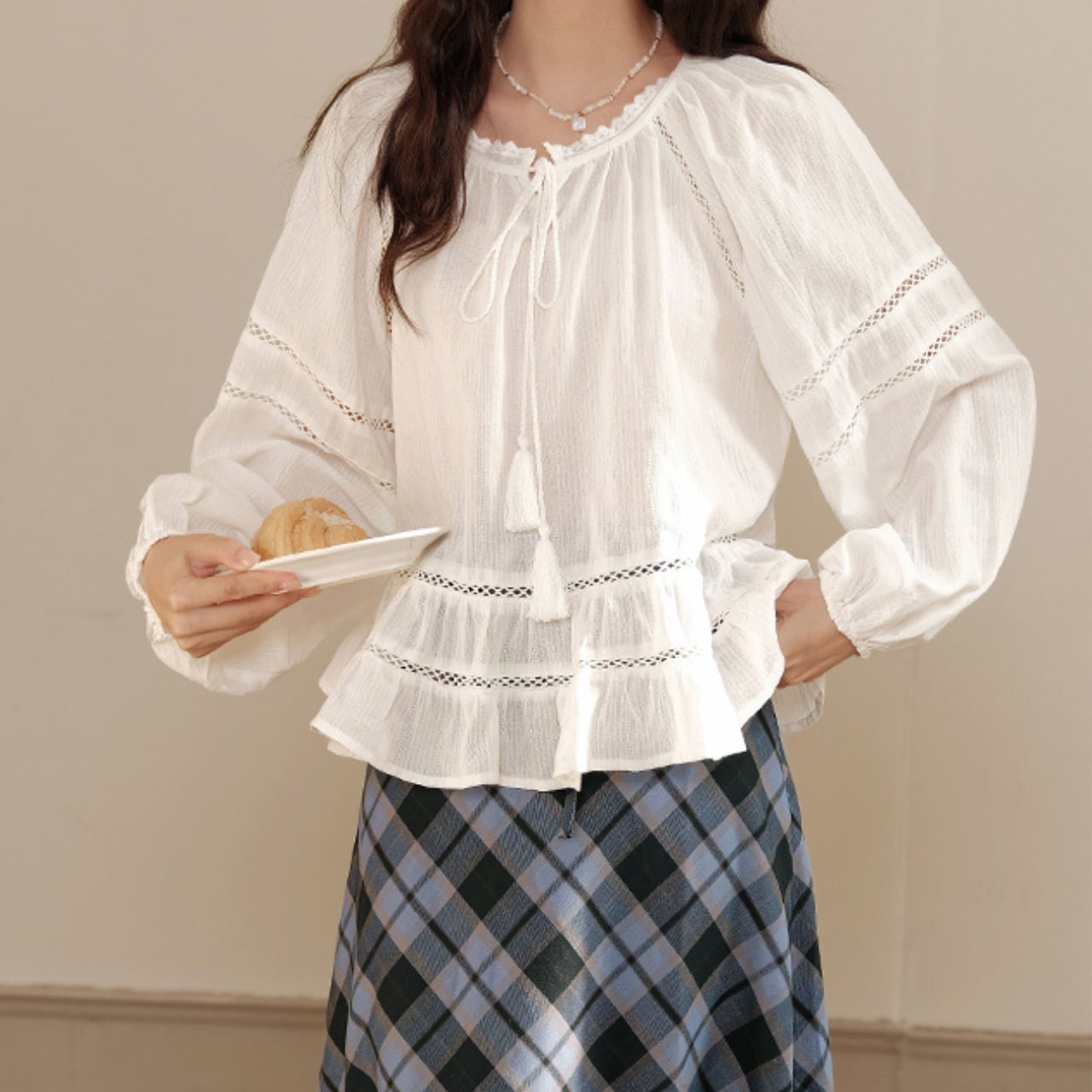 軽やかな素材感とやさしいオフホワイトカラーが、女性らしいやわらかさを引き立てます。