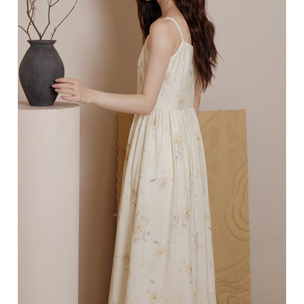 ワンピースは軽やかなコットン風素材で、ふんわり広がるシルエットが女性らしさを引き立てます。