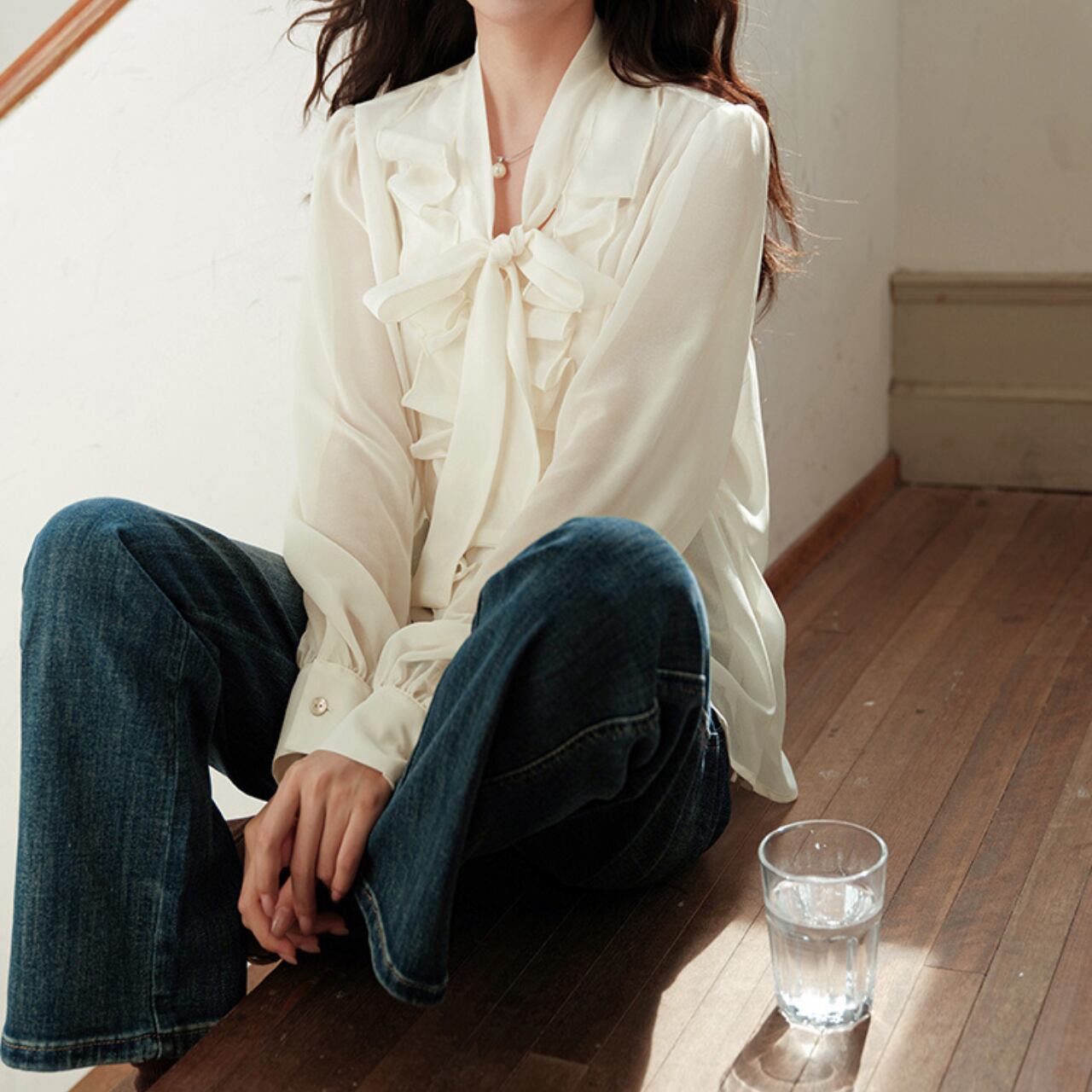 フロントにあしらわれたフリルとリボンが華やかさを添えるフェミニンブラウス。