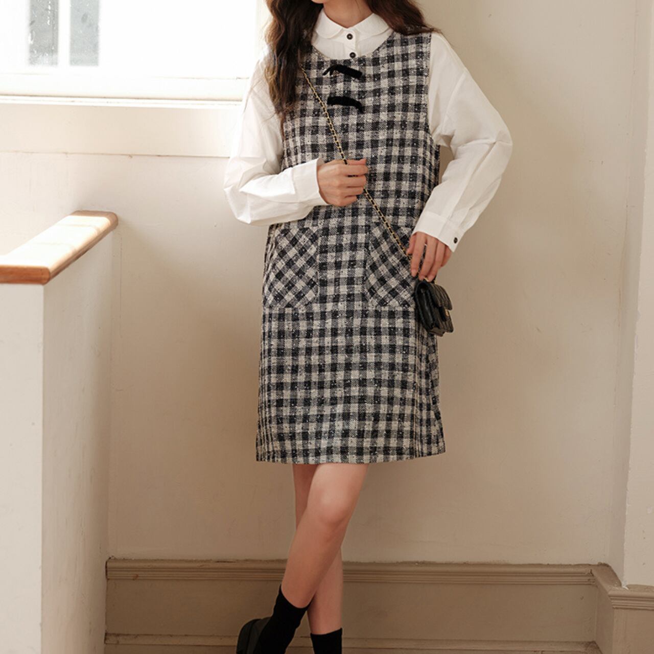 大人かわいいチェック柄のジャンパースカートと、ベーシックなホワイトブラウスのセット。