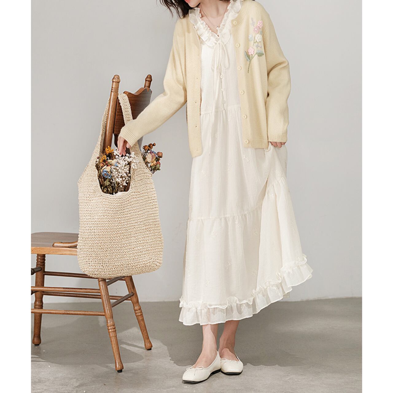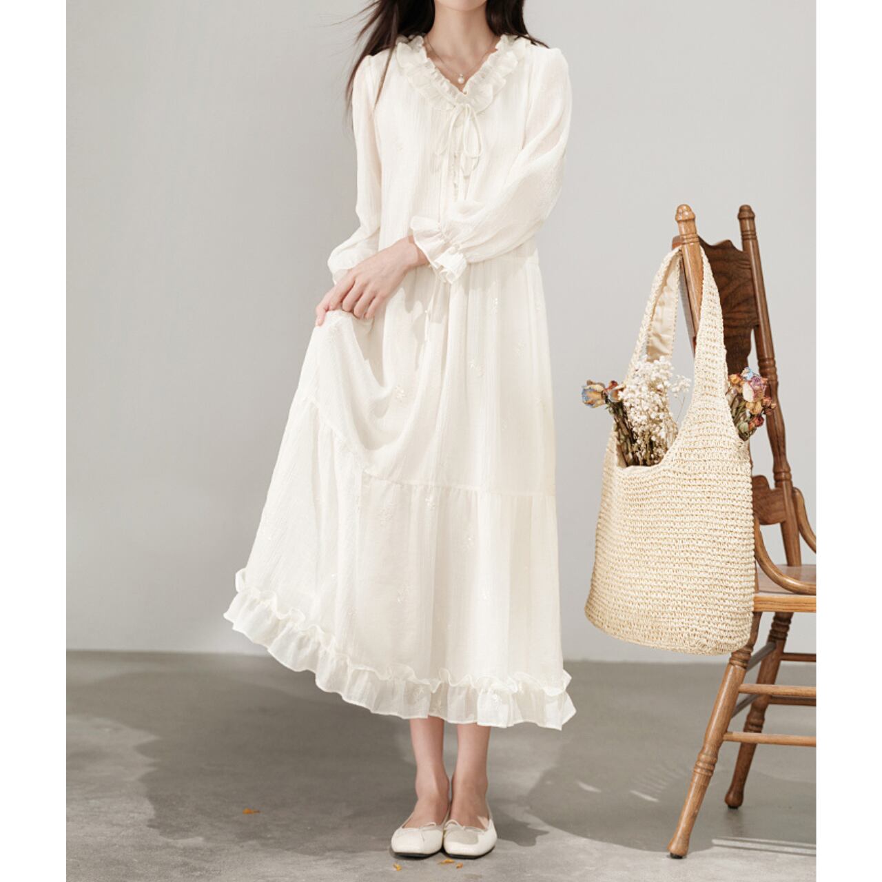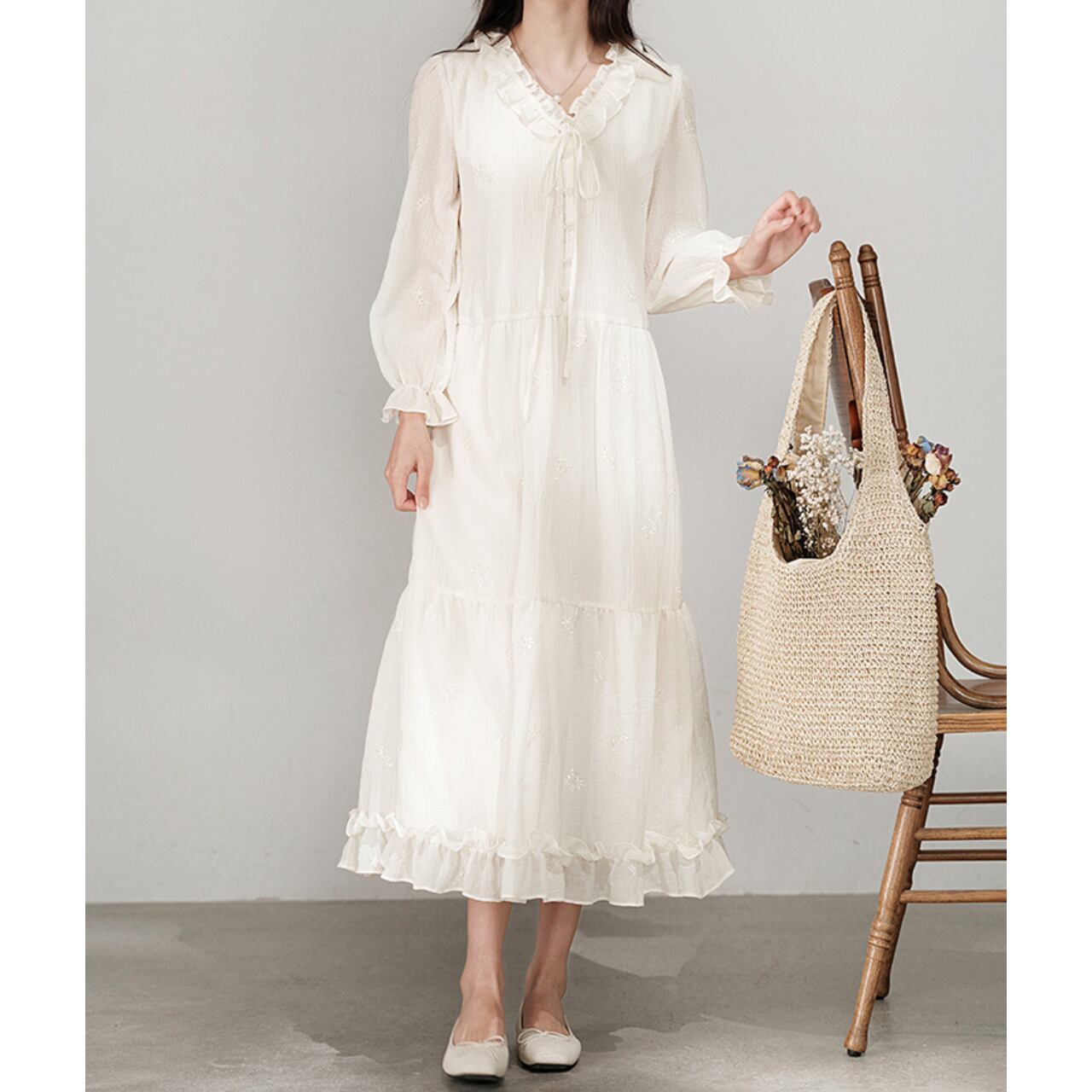 ふんわり広がるシルエットとフリルのあしらいが愛らしいロングワンピース。