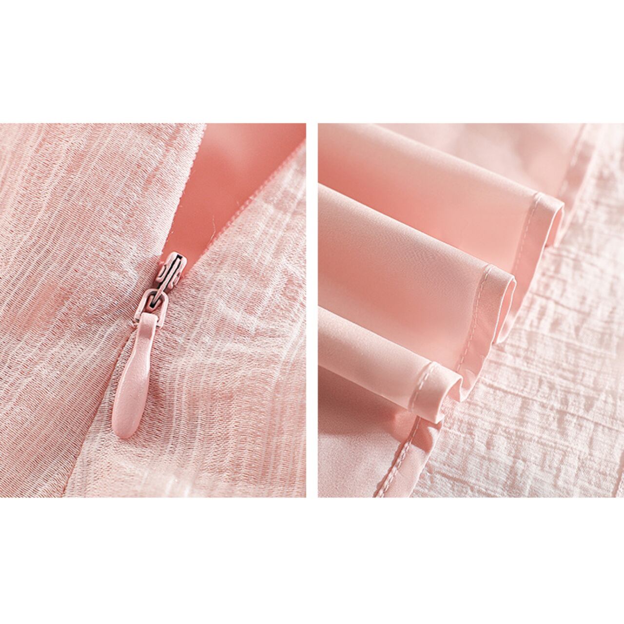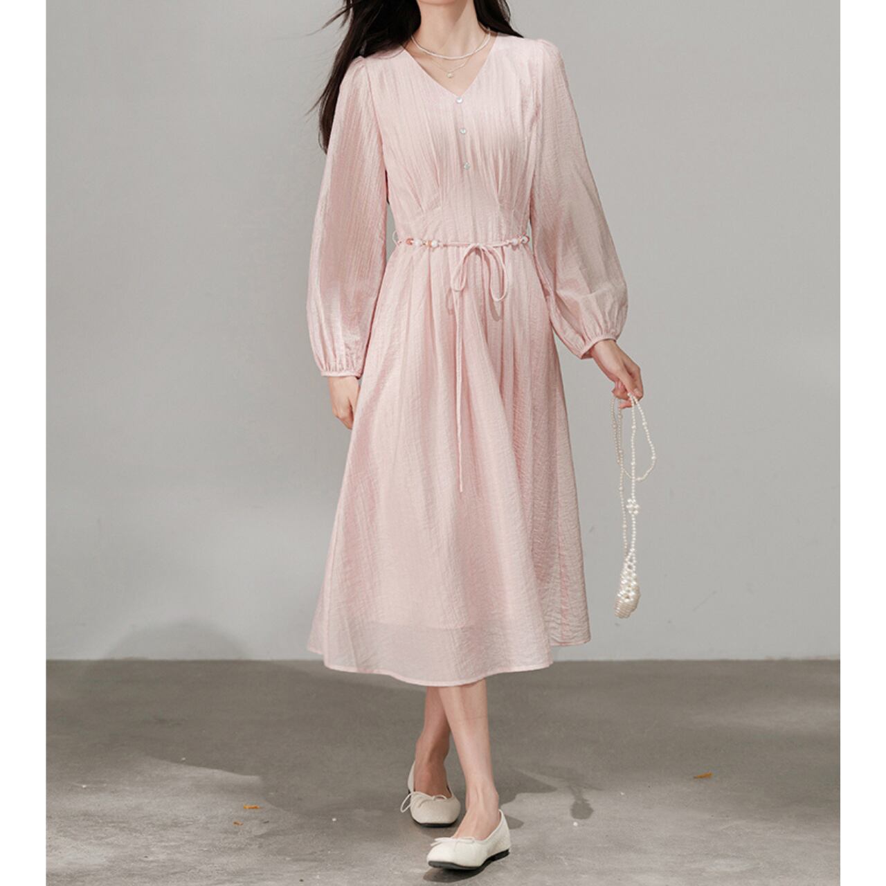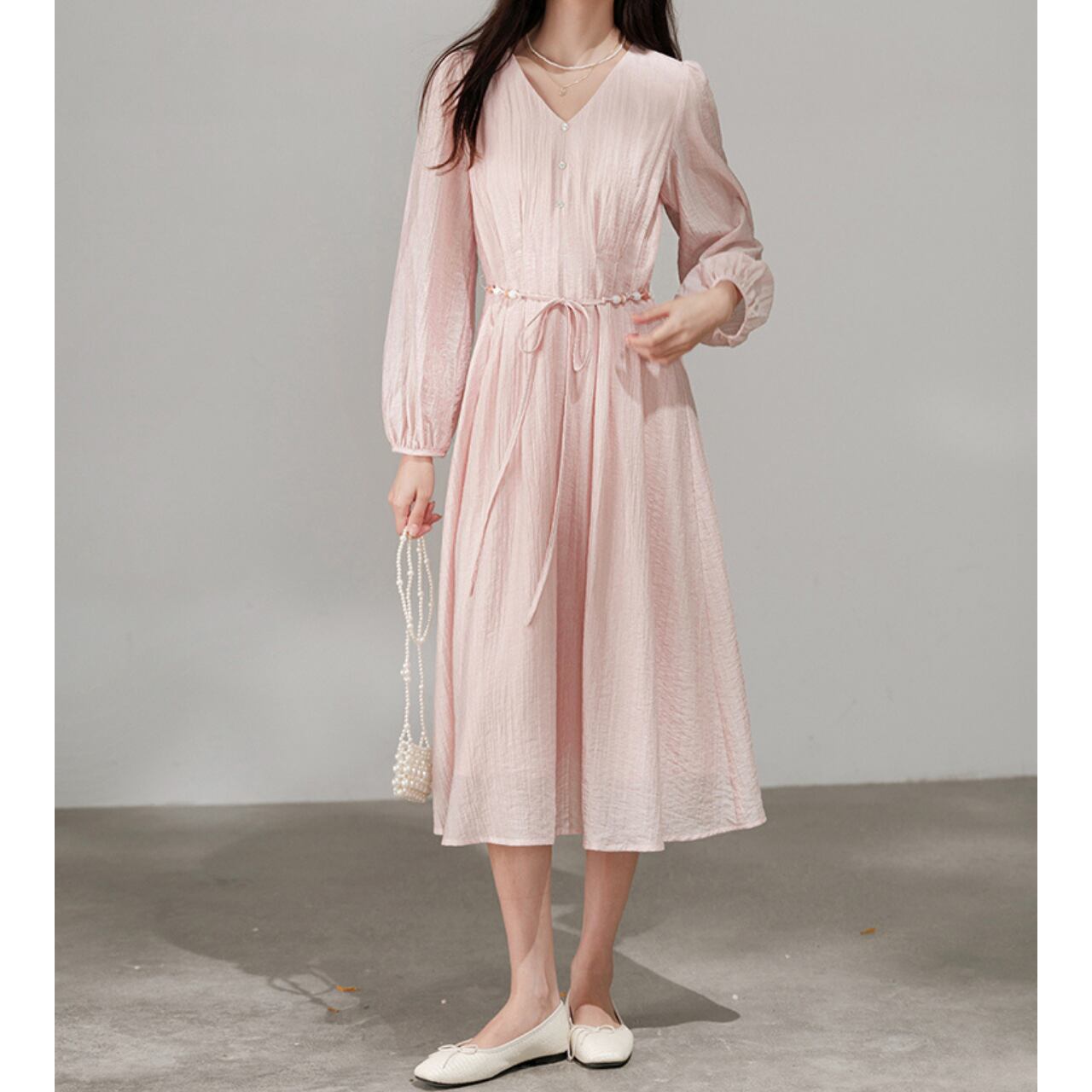 淡いピンクカラーが可憐な印象を与えるミディ丈ワンピース。