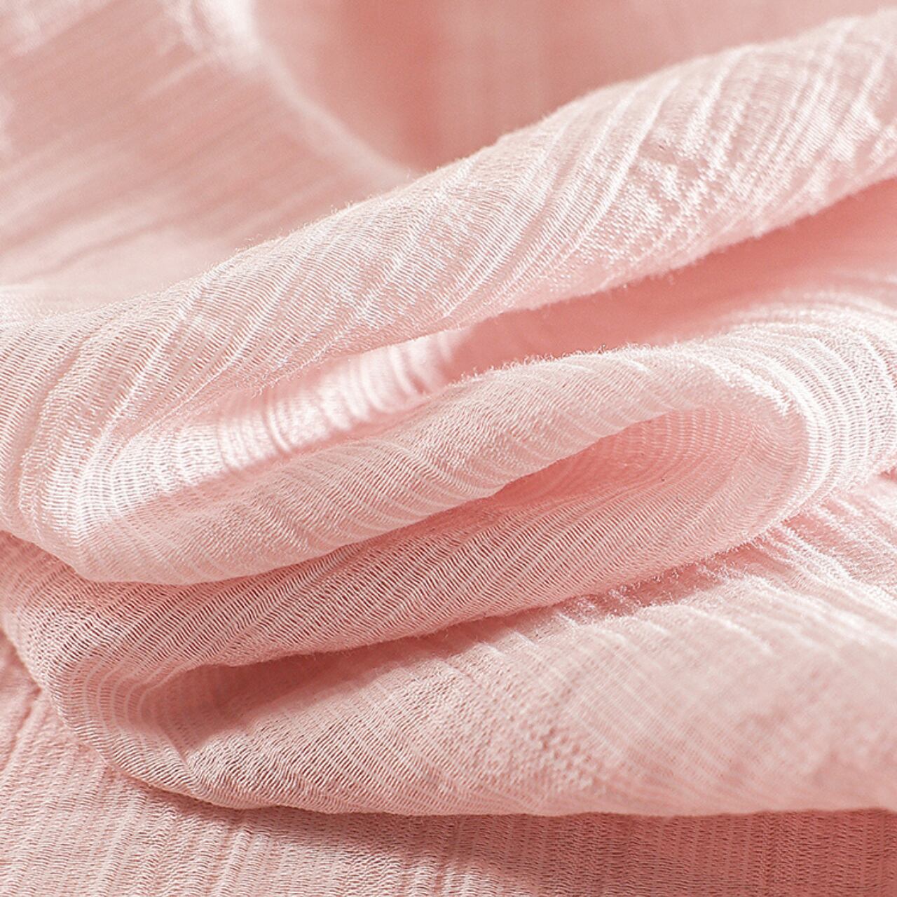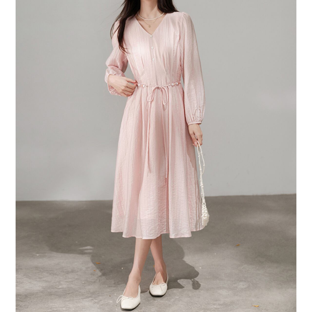 Vネックラインとウエストリボンで女性らしいシルエットを引き立て、動くたびに軽やかに揺れる素材感がポイントです。