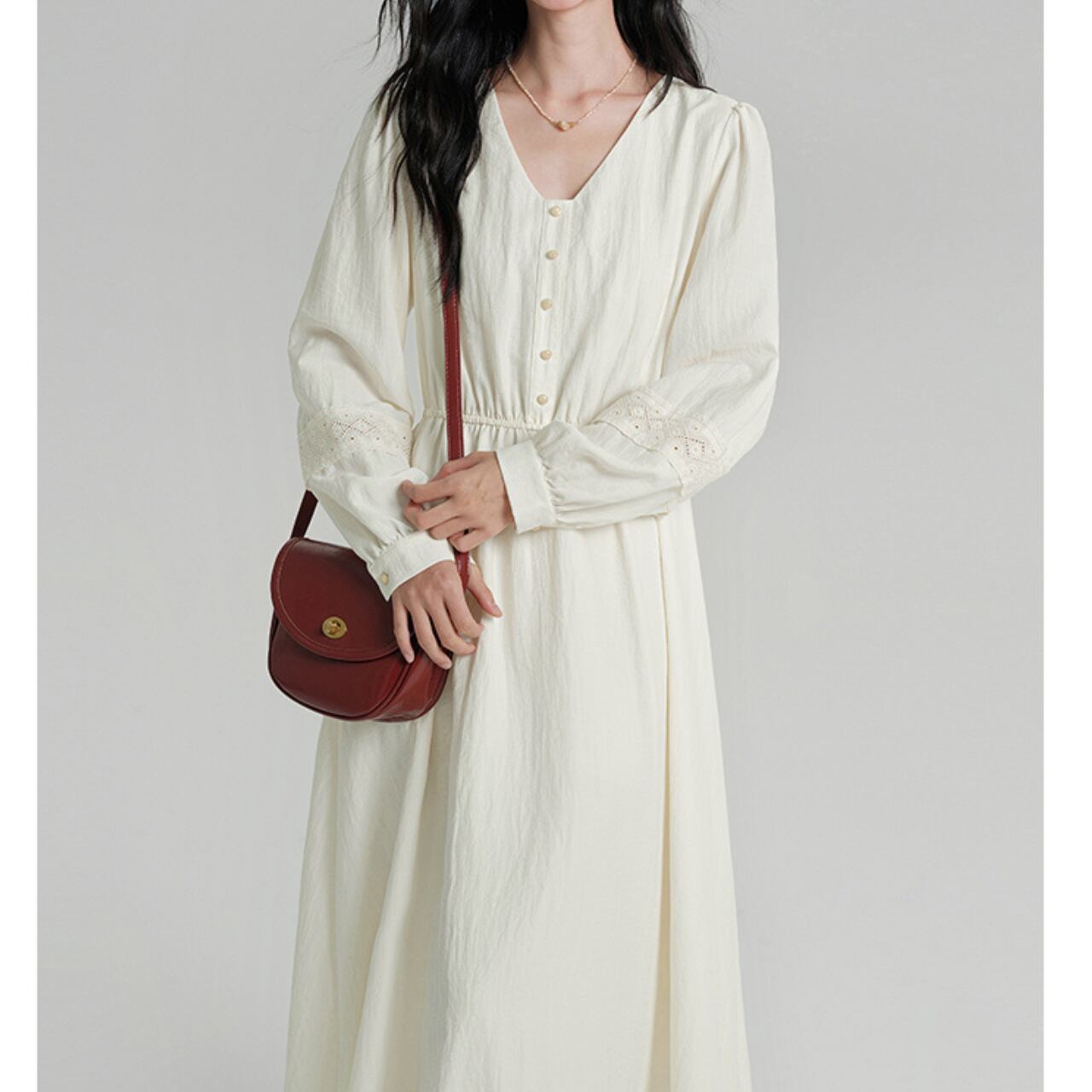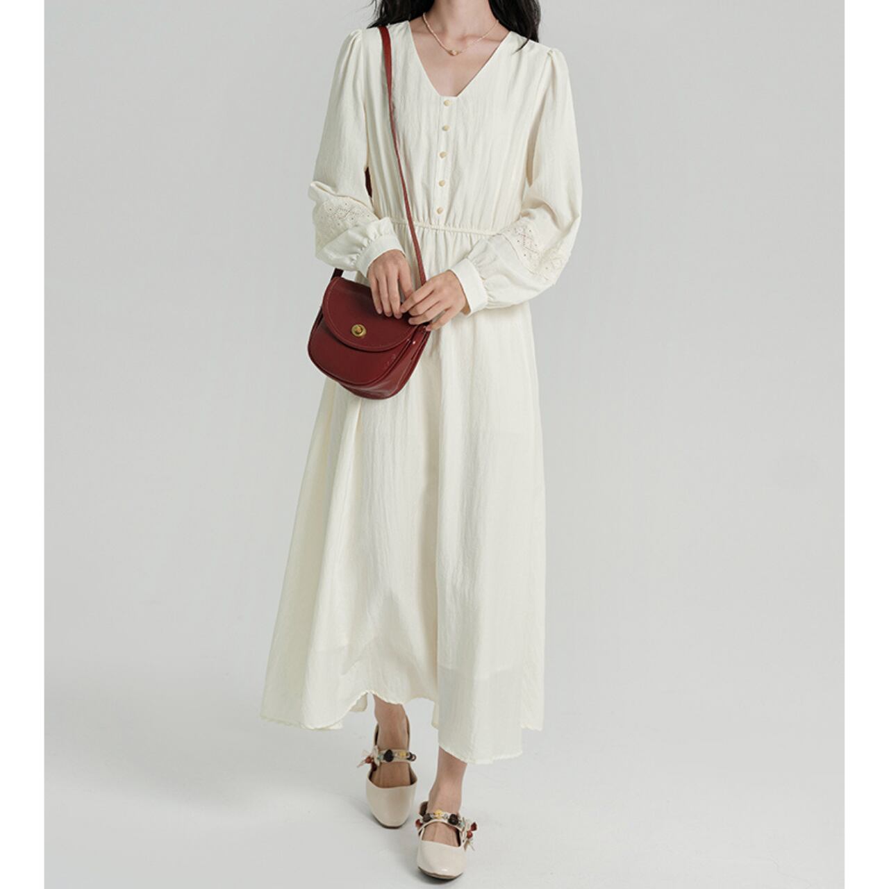 やわらかな生地感に、袖口のレースディテールがポイントのロングワンピース。