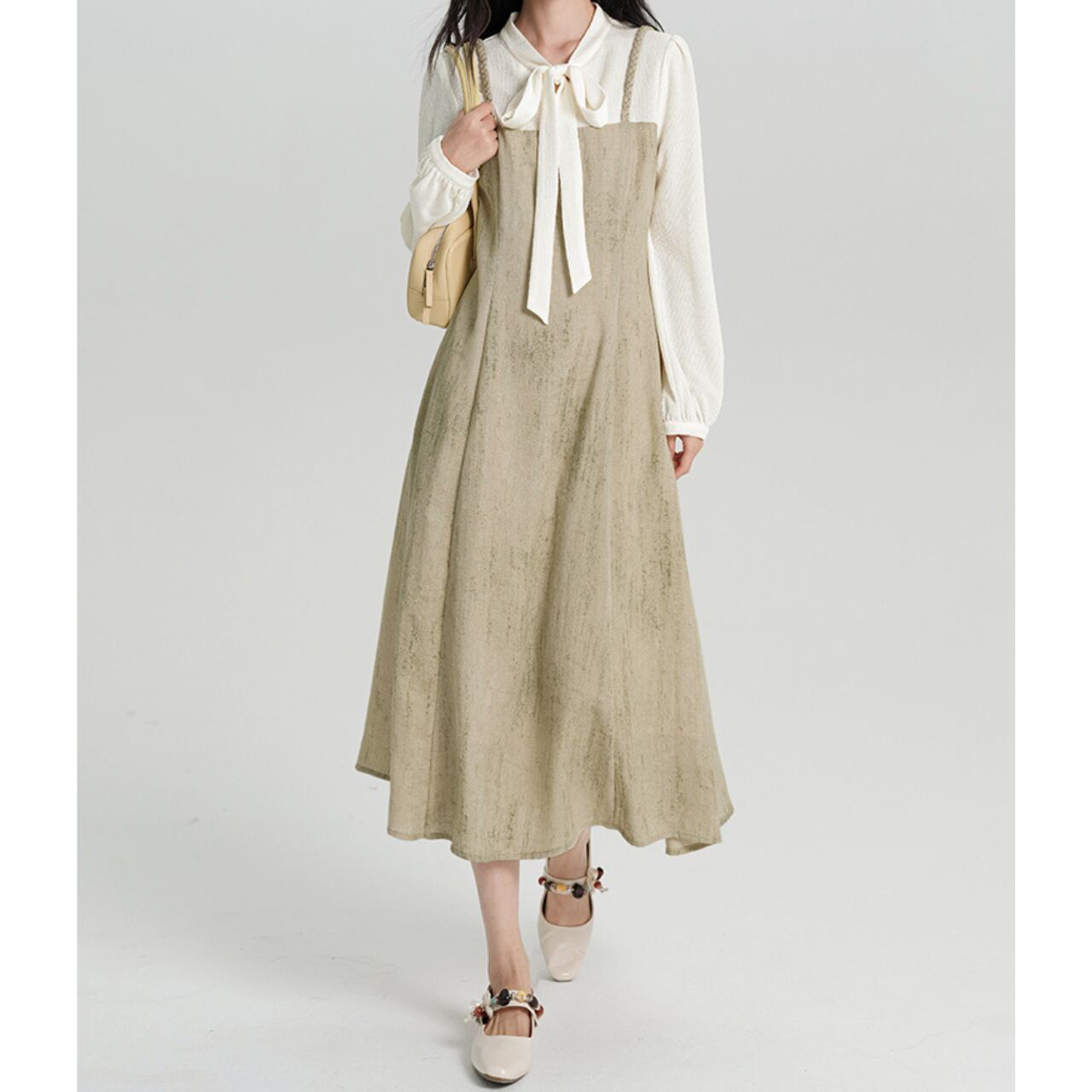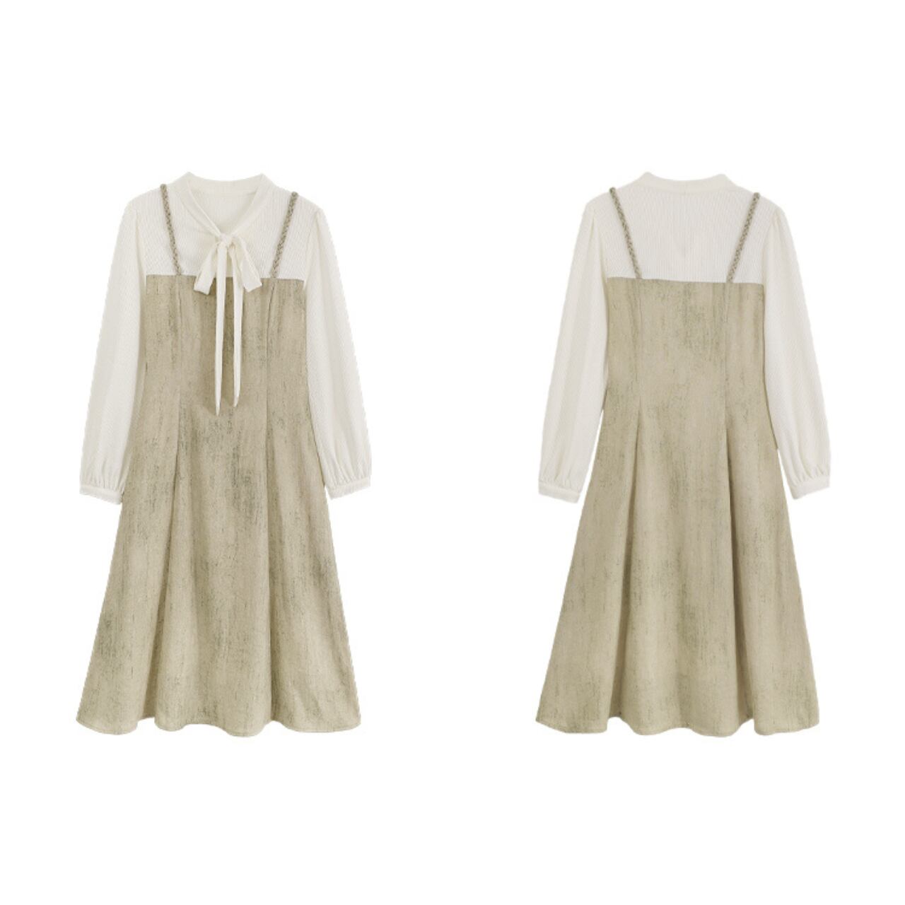 リボンタイ付きのブラウスと、ニュアンス感のあるワンピースを重ねたようなフェミニンワンピース。淡いトーンのプリントが優しい表情を添え、女性らしい柔らかさを引き立てます。1枚でレイヤードスタイルが完成するので、忙しい朝にもさっとお洒落に。カーディガンやジャケットを羽織れば、オンにもオフにも使える万能アイテムです。