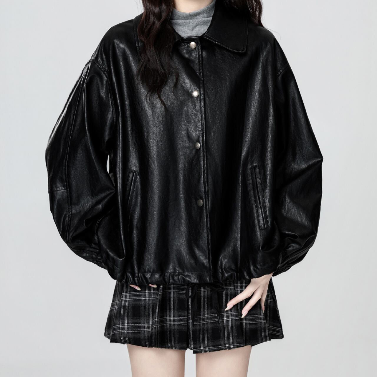 存在感のあるオーバーサイズシルエットが魅力のレザージャケット。ゆったりとしたドロップショルダーがこなれ感を演出し、インナーを選ばずに着回しやすい一枚です。シンプルながらもモードな雰囲気を纏え、スカート合わせでフェミニンに、デニムと合わせてカジュアルにと幅広いスタイリングに活躍します。季節の変わり目にさらっと羽織れる万能アウターです。