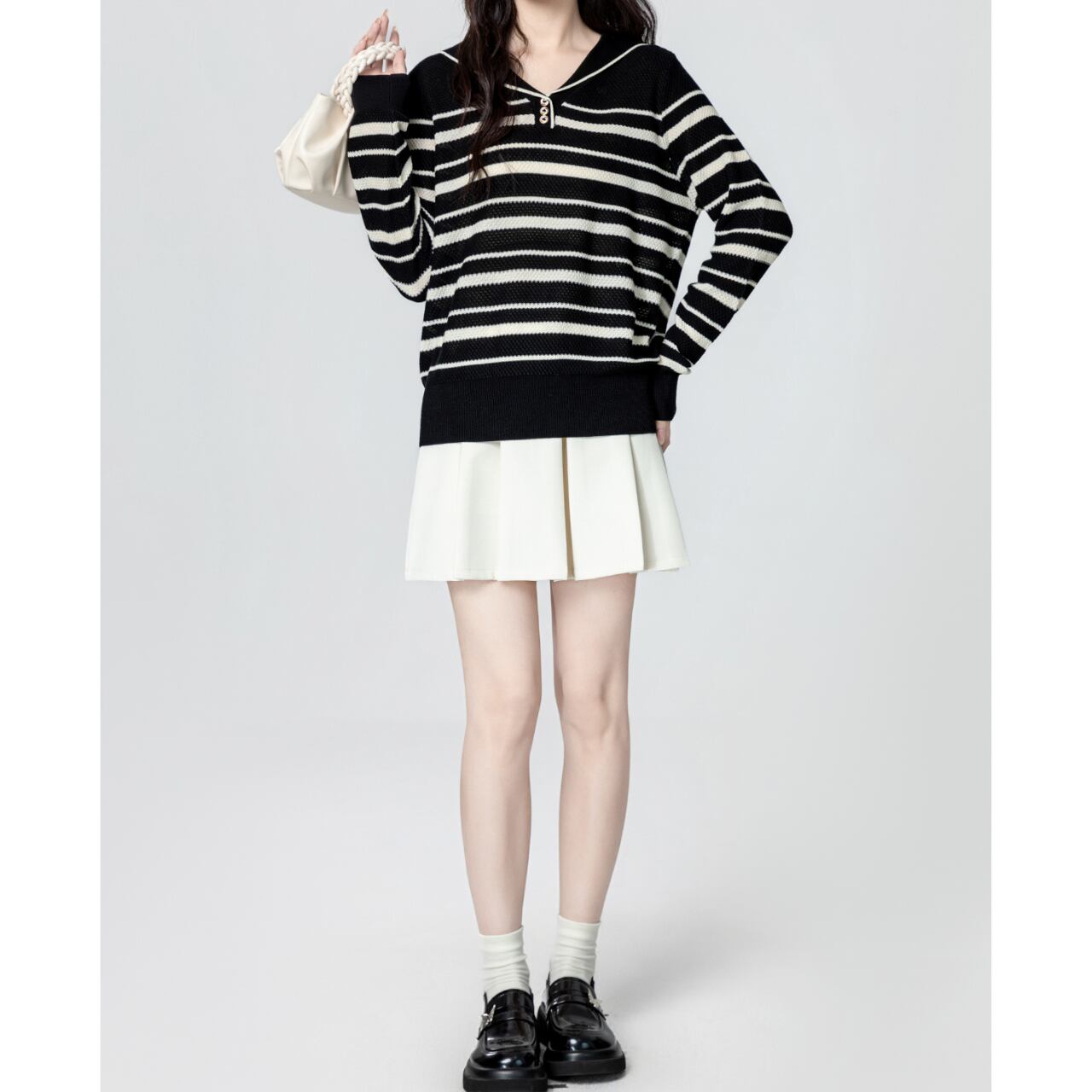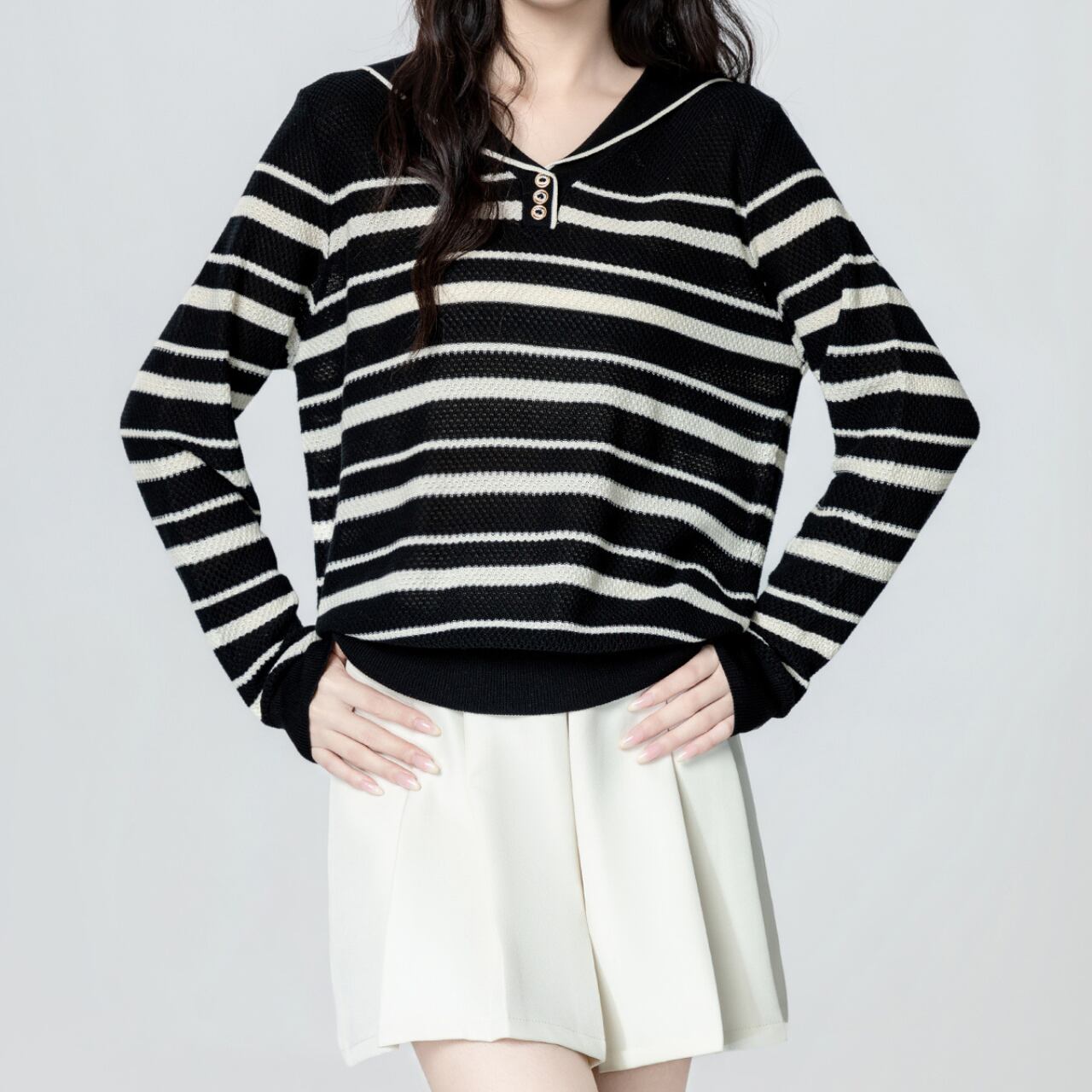 セーラーカラーが愛らしいアクセントになったボーダーニット。すっきりとしたVネックとゴールドボタンが上品さを添え、甘さとカジュアルさを絶妙にミックスした一枚です。ふんわりシルエットで着心地も良く、ミニスカートやデニムなど幅広いスタイルにマッチ。大人可愛いマリンテイストを楽しめるアイテムです。