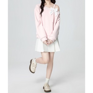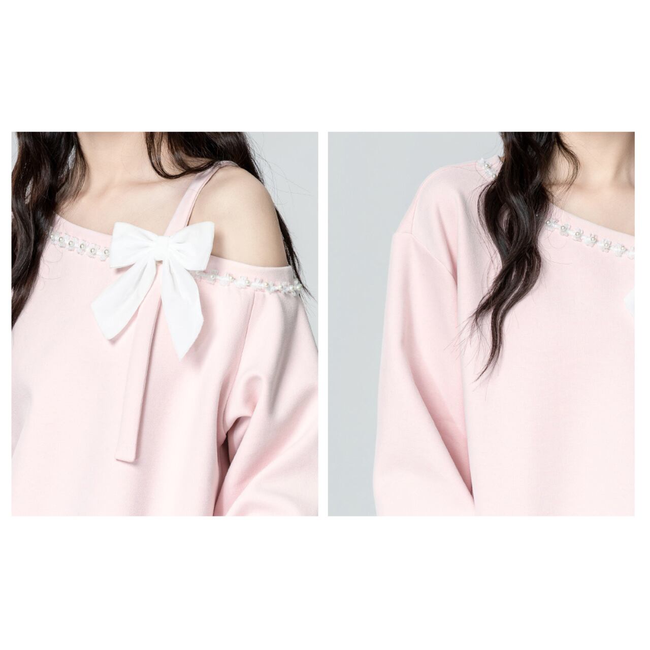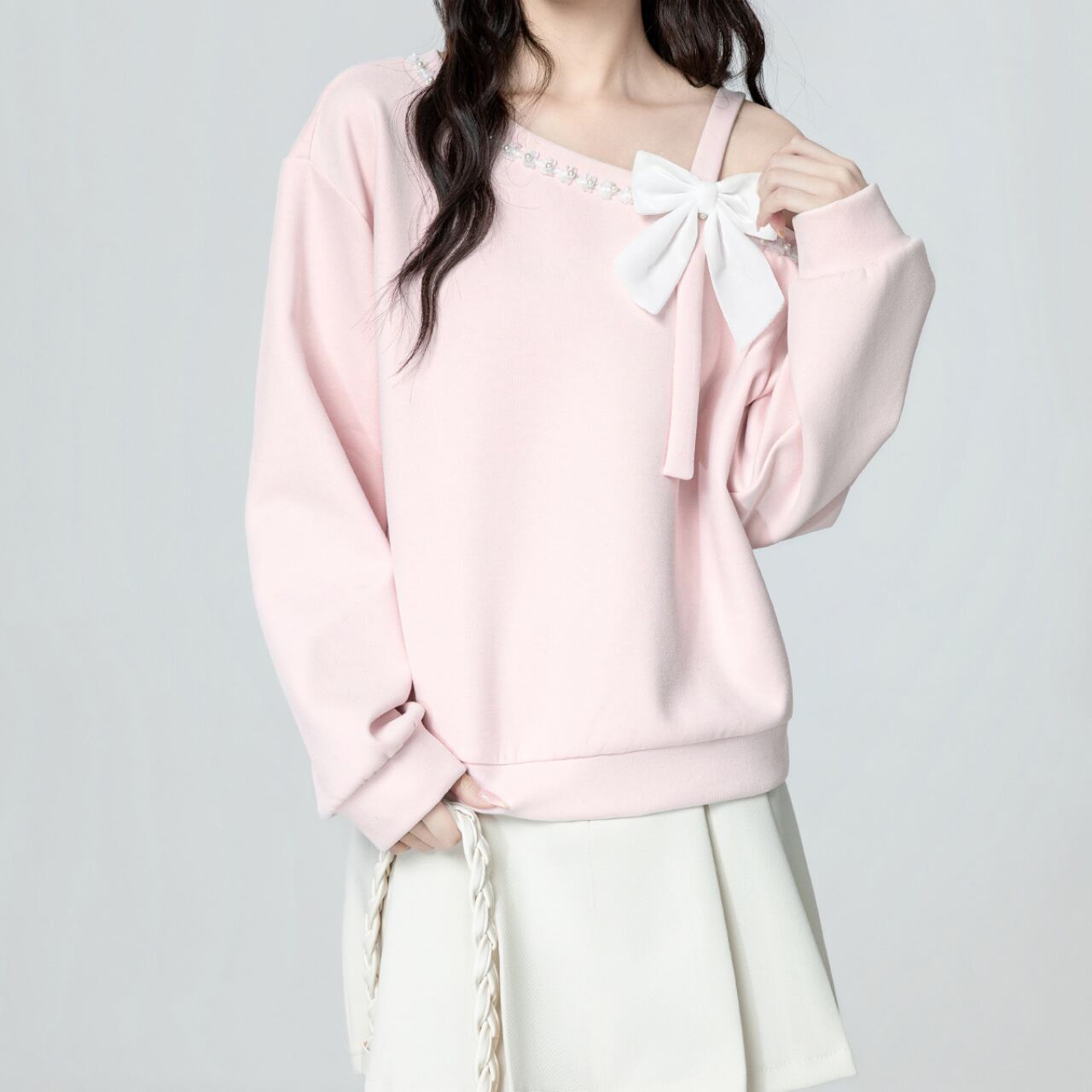 淡いピンクカラーにホワイトリボンをあしらった、ガーリーなオフショル風スウェット。肩のビジュー風デザインが華やかさをプラスし、カジュアルながらもフェミニンな印象に仕上げています。ふんわりシルエットでリラックス感がありながら、スカートやパンツとも好相性。デイリー使いからお出かけまで幅広く活躍するアイテムです。