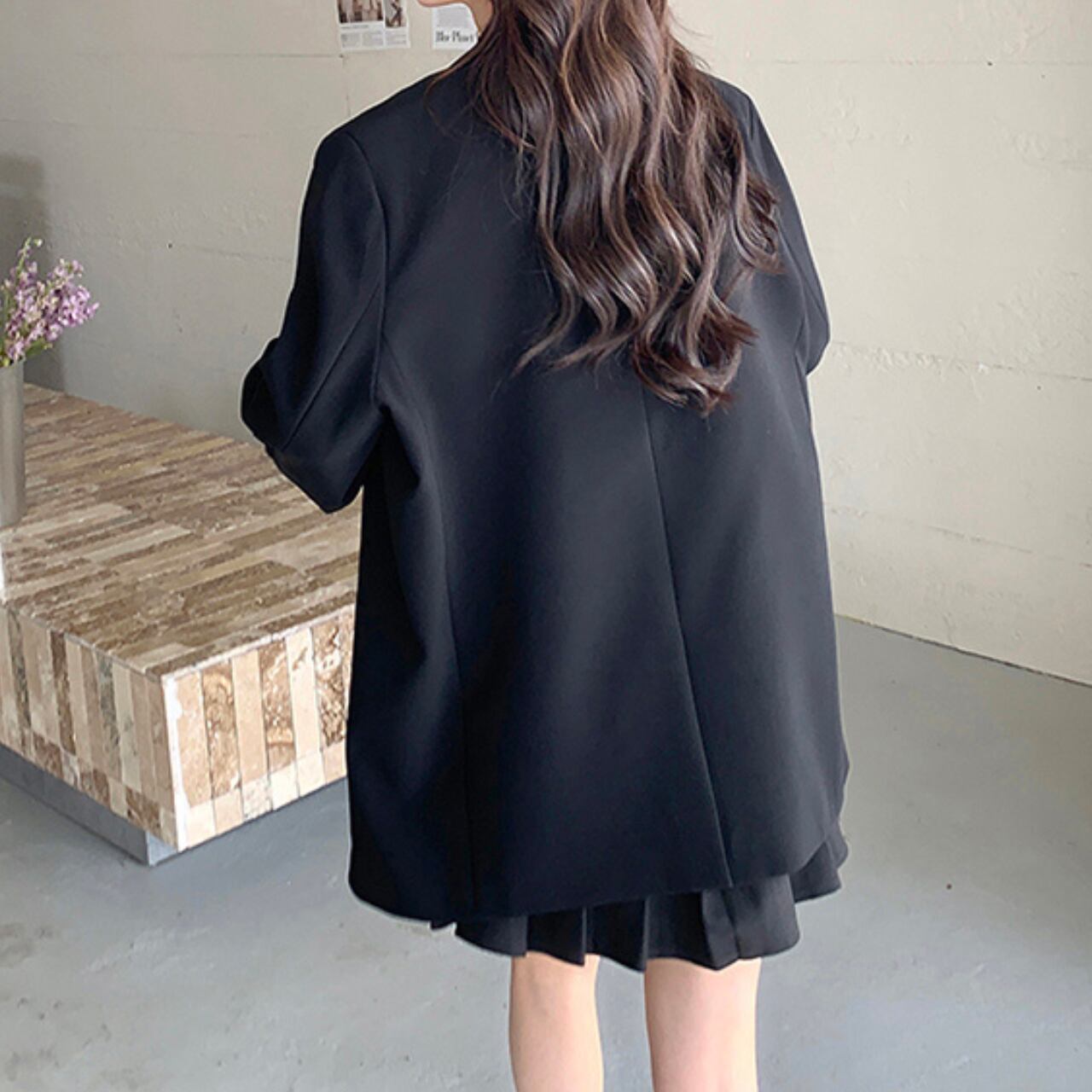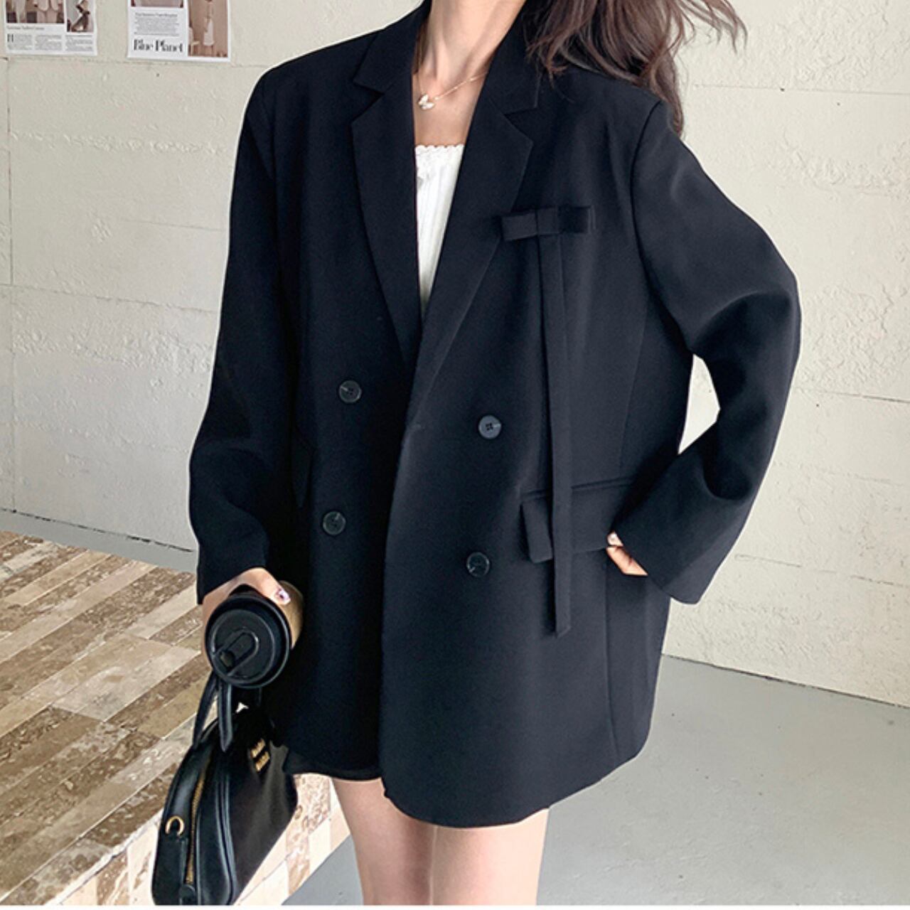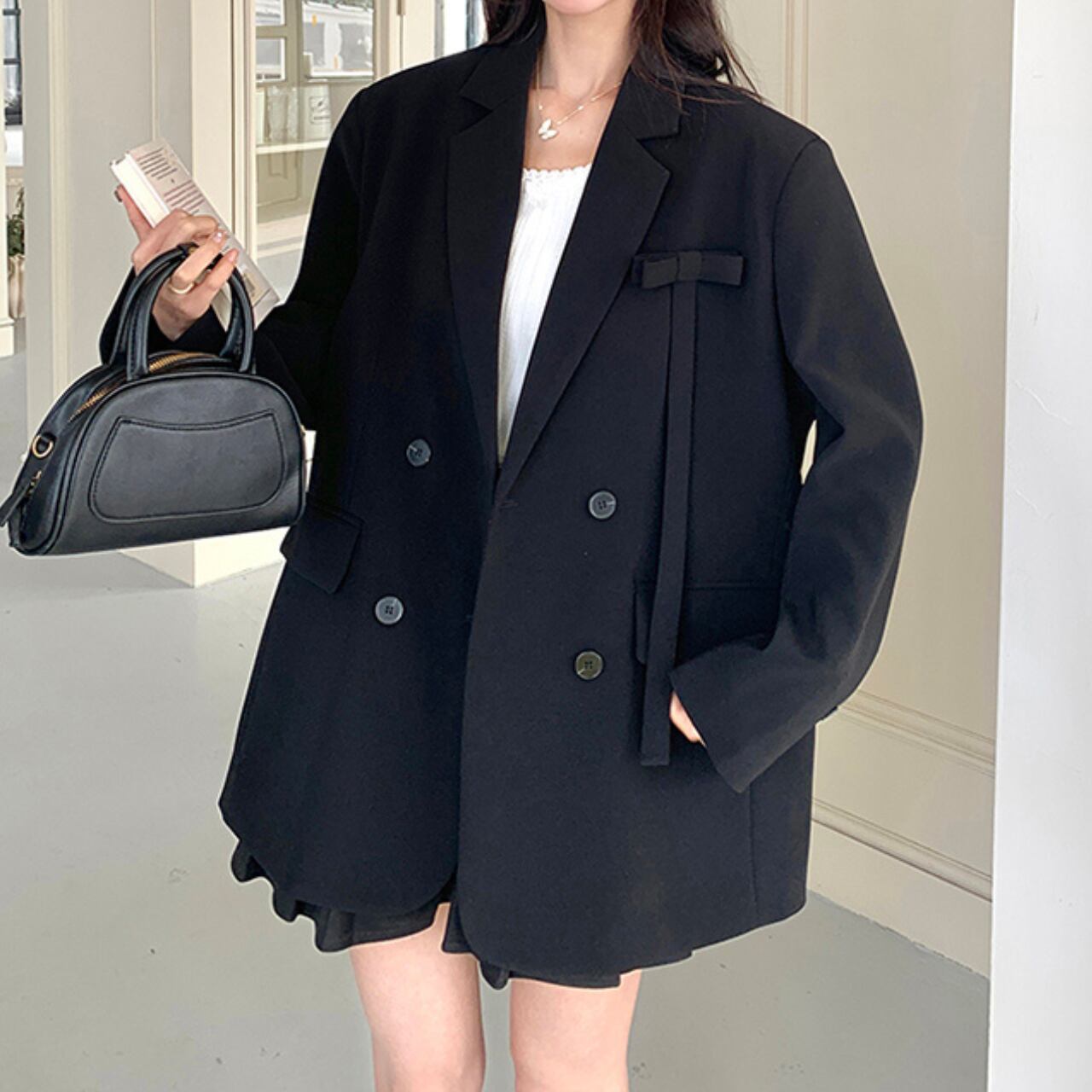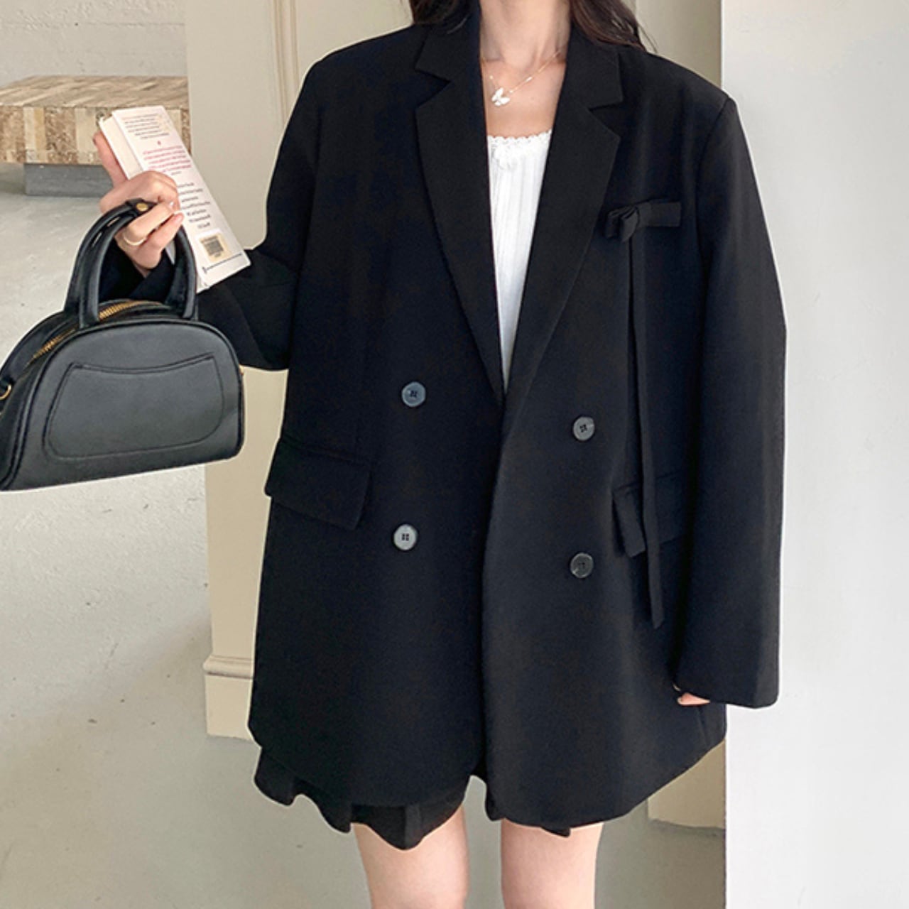 シンプルなテーラードジャケットに、さりげないリボンディテールをプラスした大人可愛い一枚。ダブルボタンのデザインがきちんと感を演出しつつ、ゆったりシルエットでこなれ感も漂わせます。ミニ丈ボトムと合わせればワンピ風に、パンツと合わせればマニッシュにと幅広く着回せる万能アイテムです。