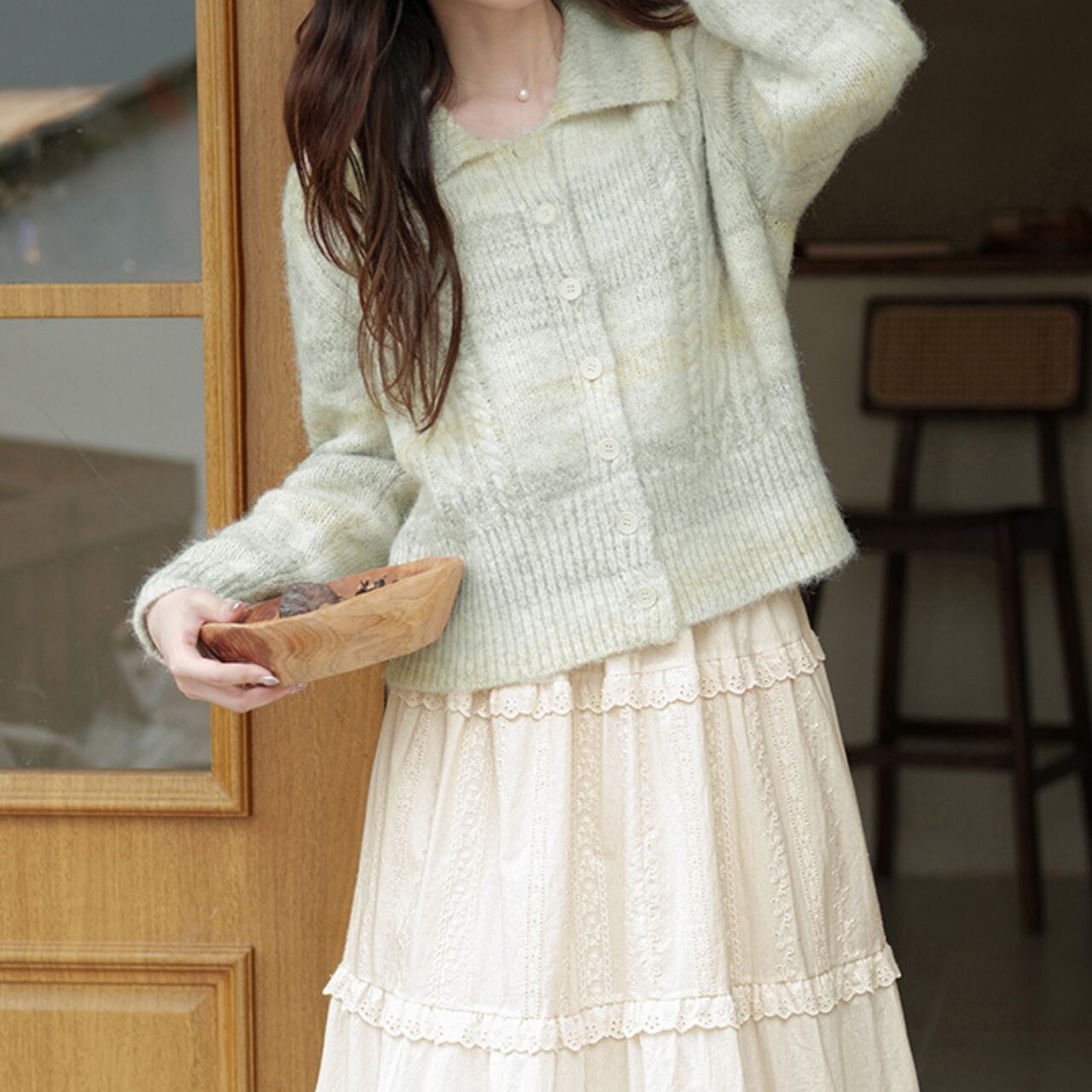 ふんわりとしたパステル調のグラデーションが優しい雰囲気を演出するニットカーディガン。ケーブル編みとやわらかな風合いがフェミニンカジュアルにぴったりで、軽やかに羽織れる一枚です。ボタンを閉じてトップス風に着ても、ワンピースやブラウスの上に羽織っても可愛らしく決まります。春先や秋口のお出かけにおすすめのアイテムです。