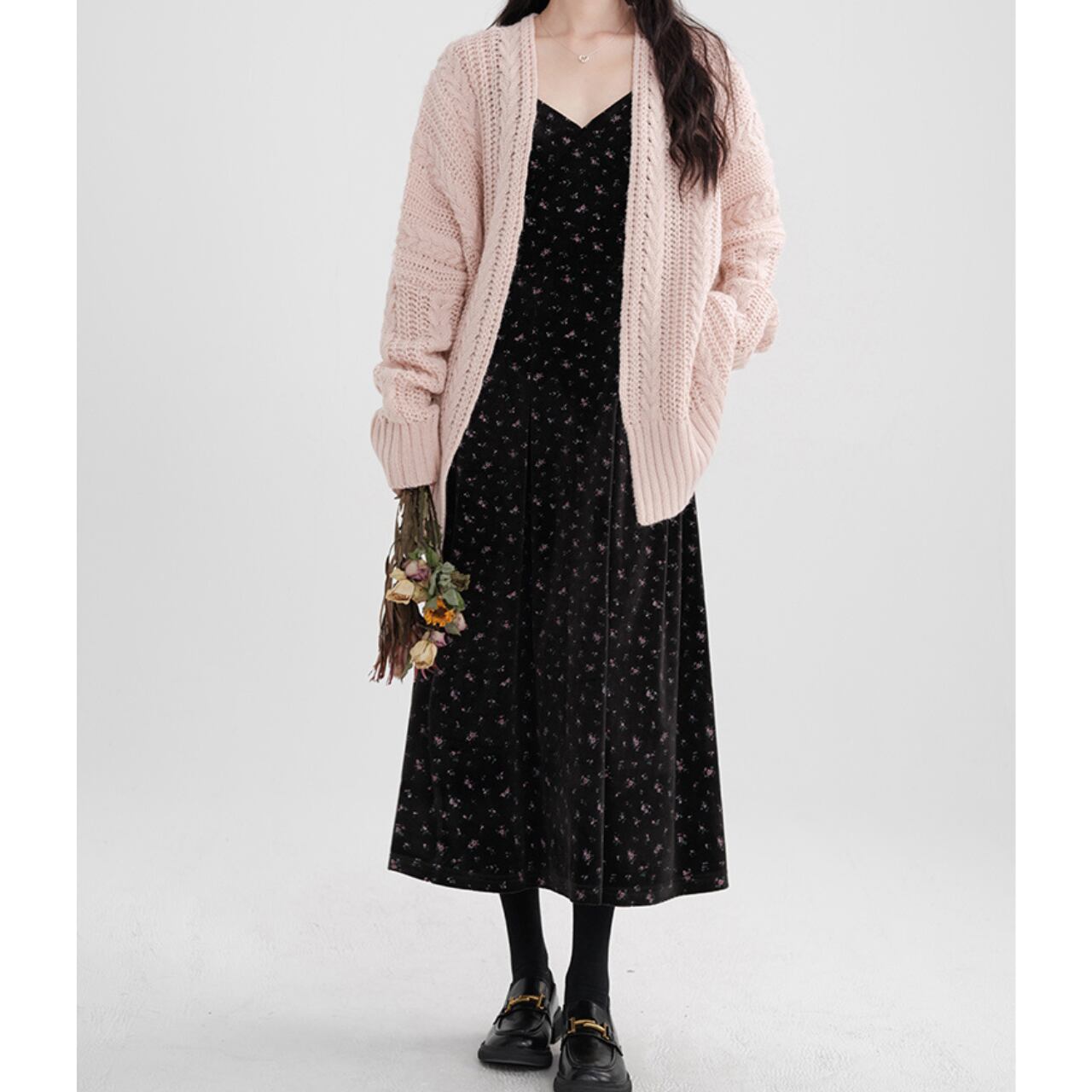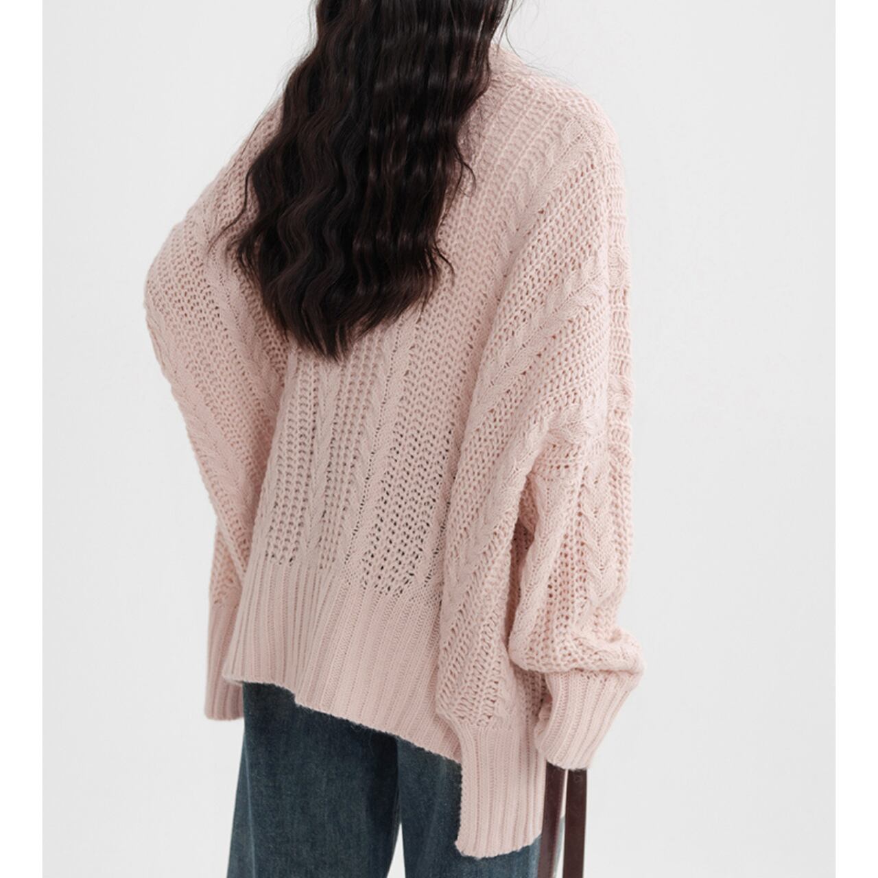 ふんわりとした編地と優しいピンクカラーが魅力のざっくりカーディガン。ボリューム感のあるシルエットがこなれた印象を与えつつ、女性らしい柔らかさを引き立てます。ワンピースに羽織ってフェミニンに、デニムと合わせてカジュアルダウンも楽しめる万能アイテム。肌寒い季節にぴったりな、心地よい一枚です。