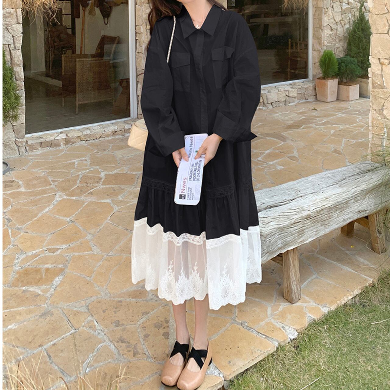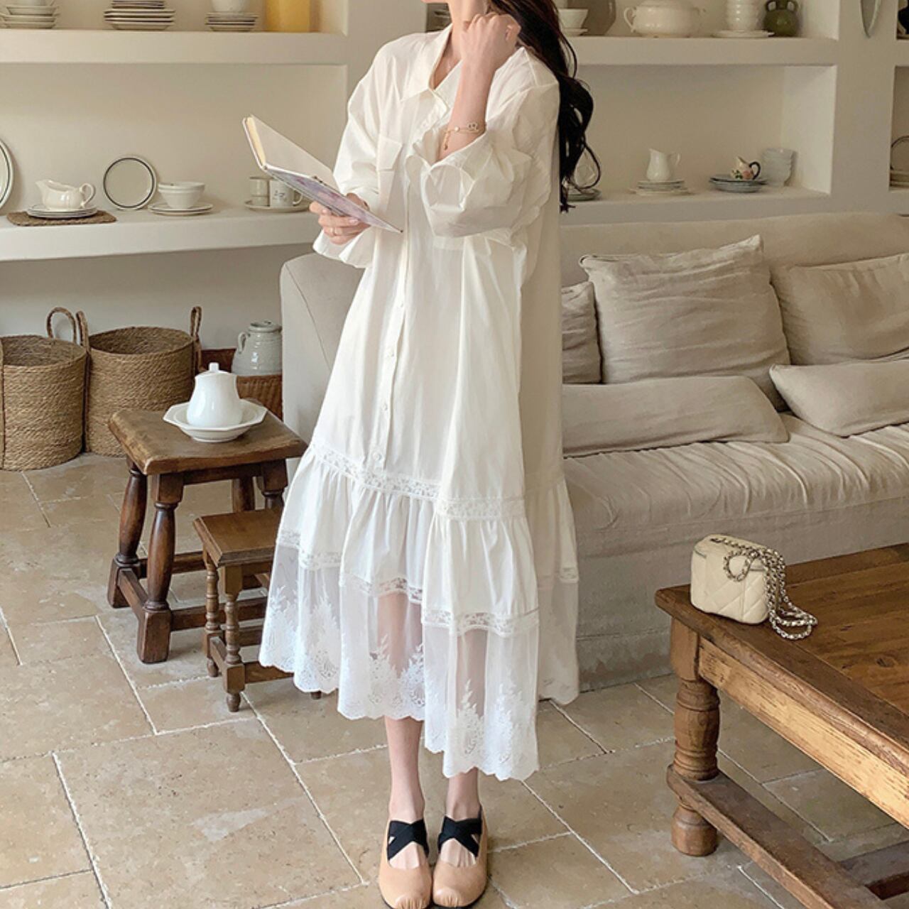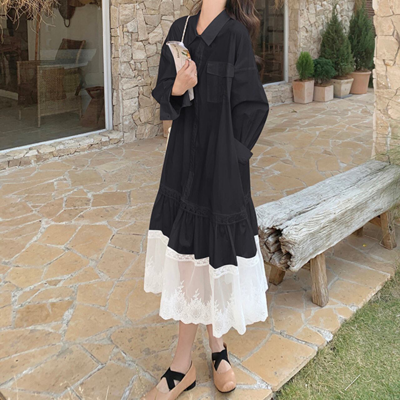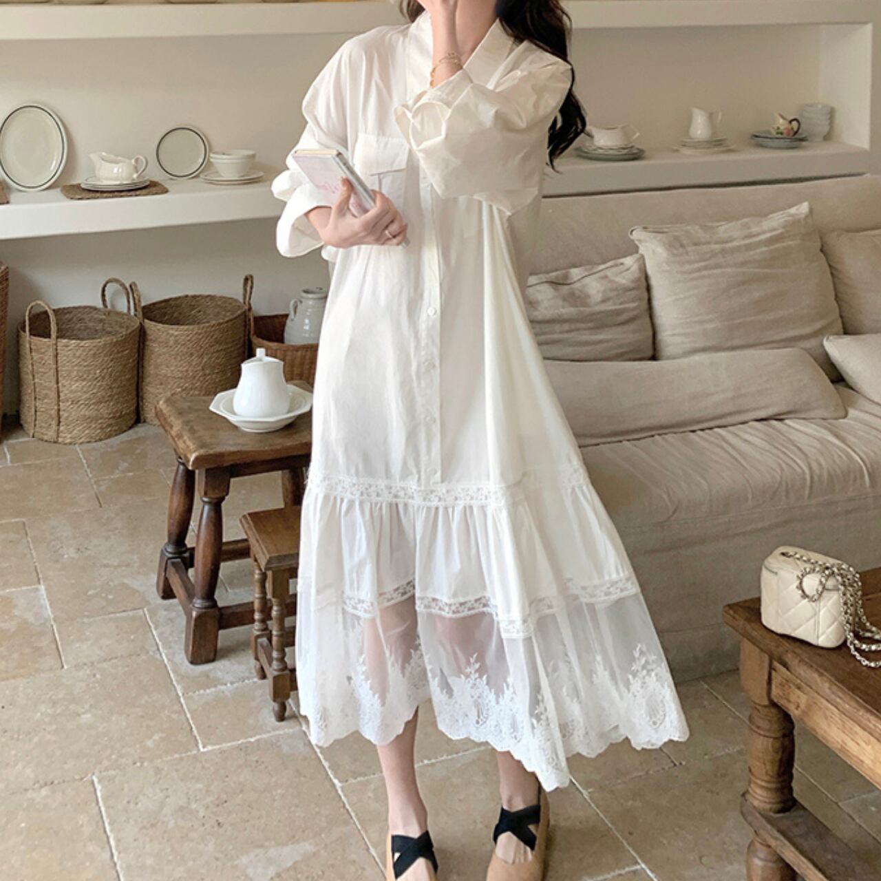 シャツワンピースのきちんと感に、裾のレースをプラスしてフェミニンに仕上げた一枚。ゆったりとしたシルエットで着心地も軽やか、カジュアルにもお出かけにも活躍します。シンプルながらもレースの透け感が上品さを演出し、大人可愛いスタイリングを叶えてくれるアイテムです。