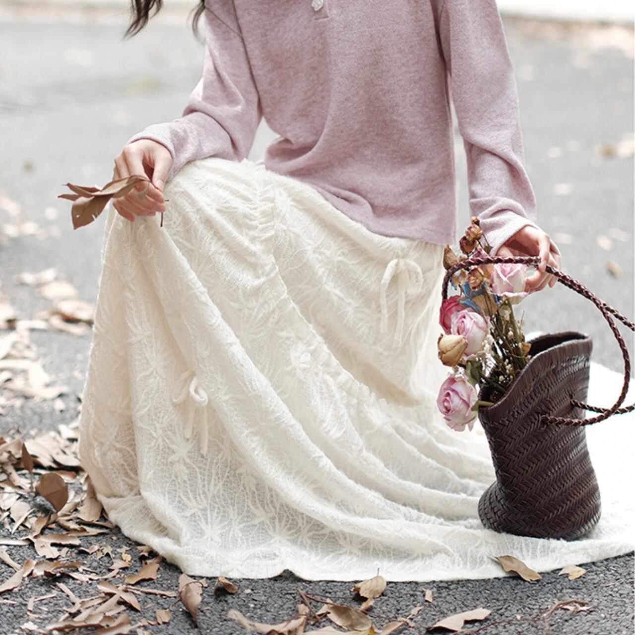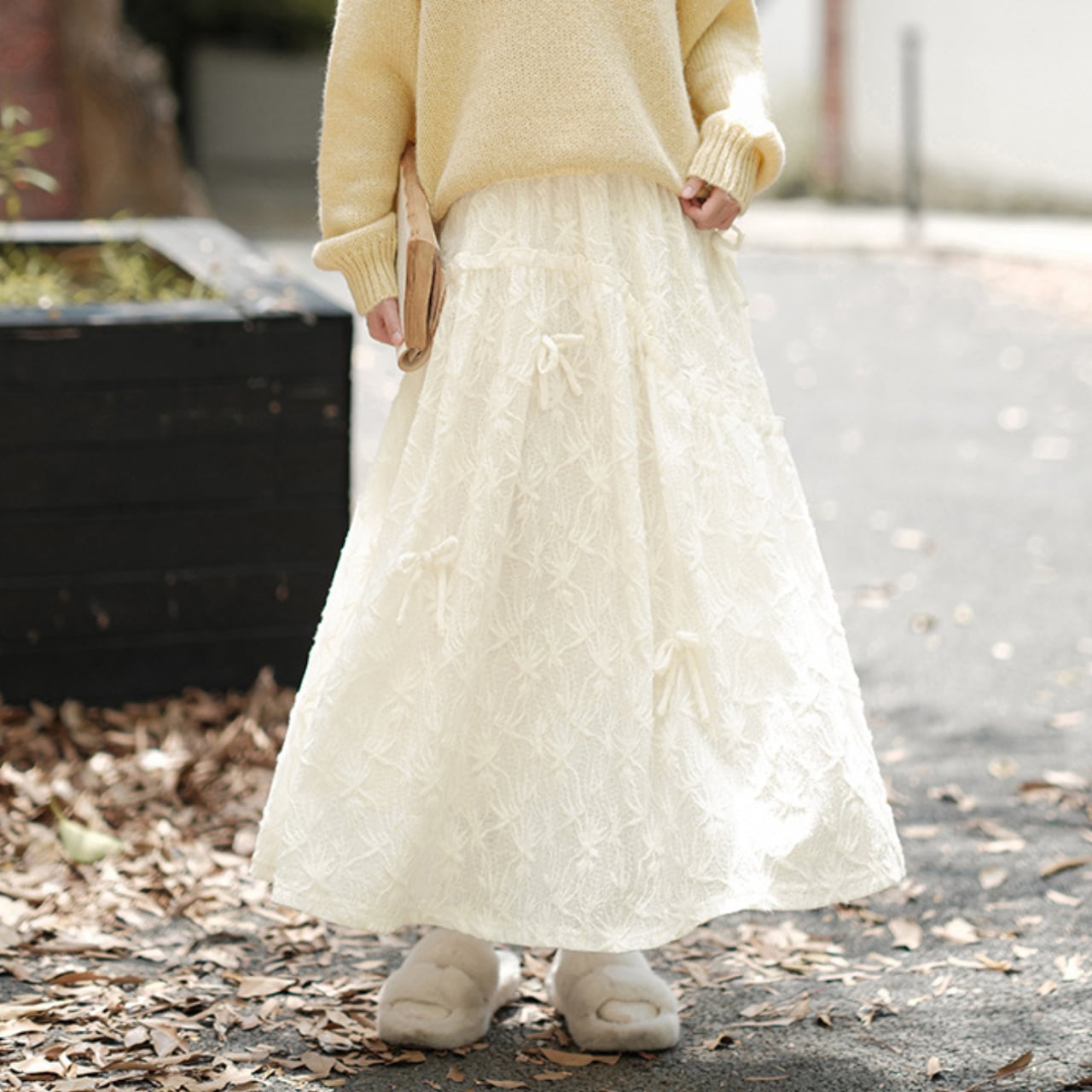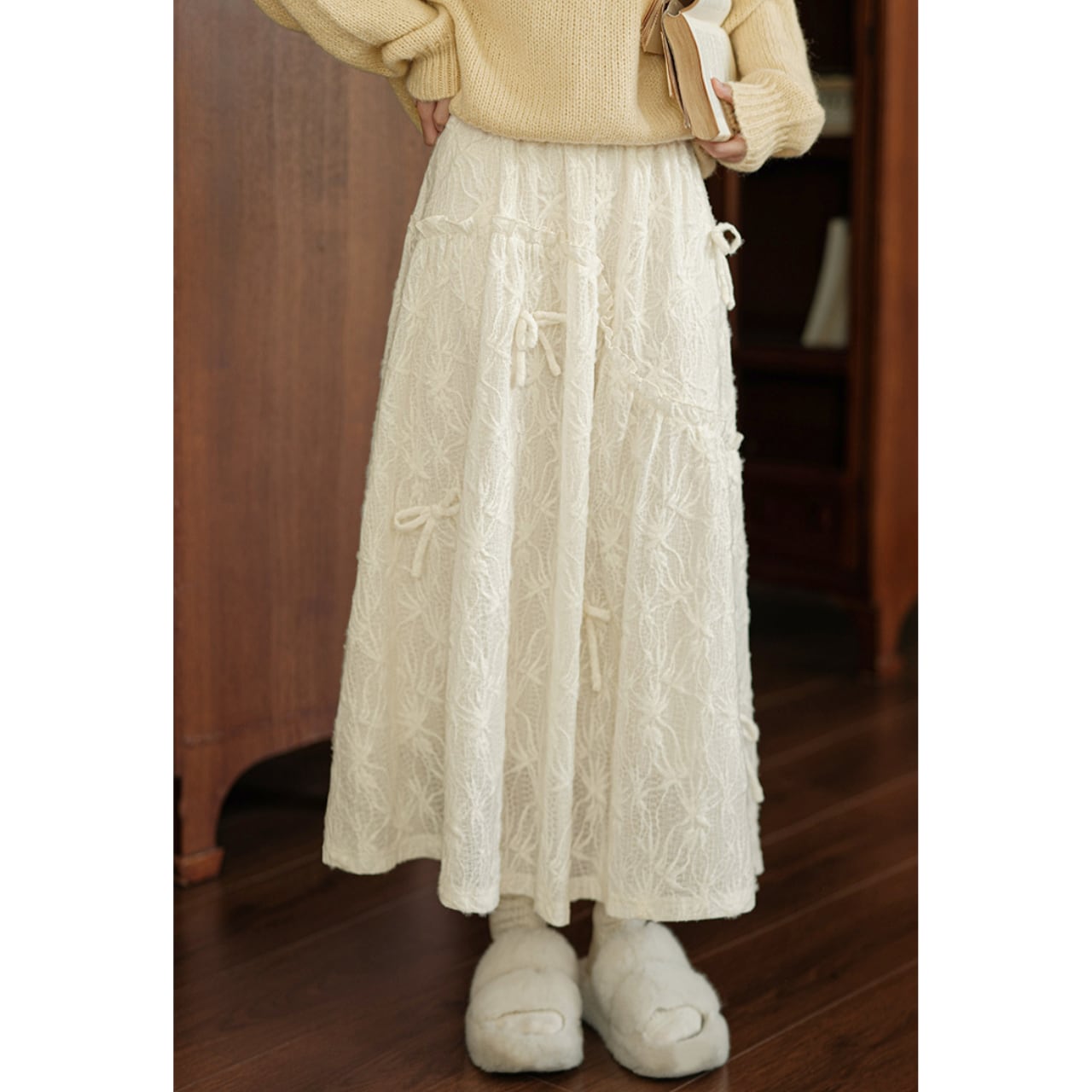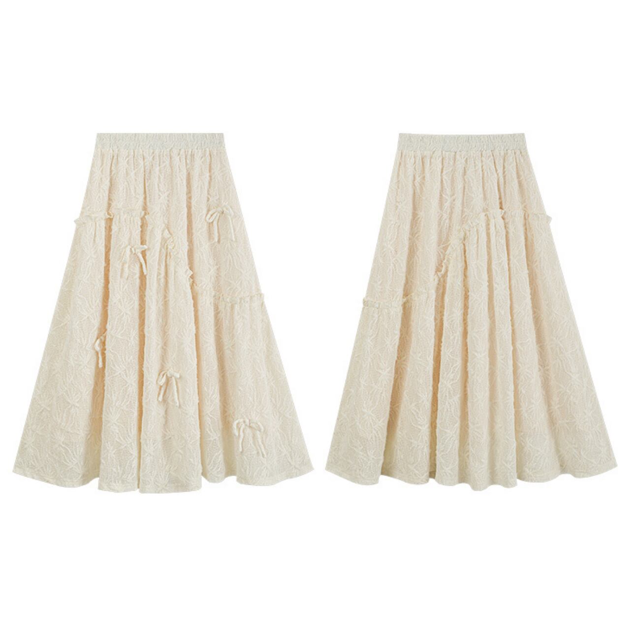 繊細なレース素材に小さなリボンをあしらったロングスカート。歩くたびにふんわり揺れて、女性らしいやわらかな雰囲気を演出します。ウエストはゴム仕様でラクに穿けるのも嬉しいポイント。シンプルなニットやブラウスと合わせて、デイリーにもお出かけにも活躍する一枚です。