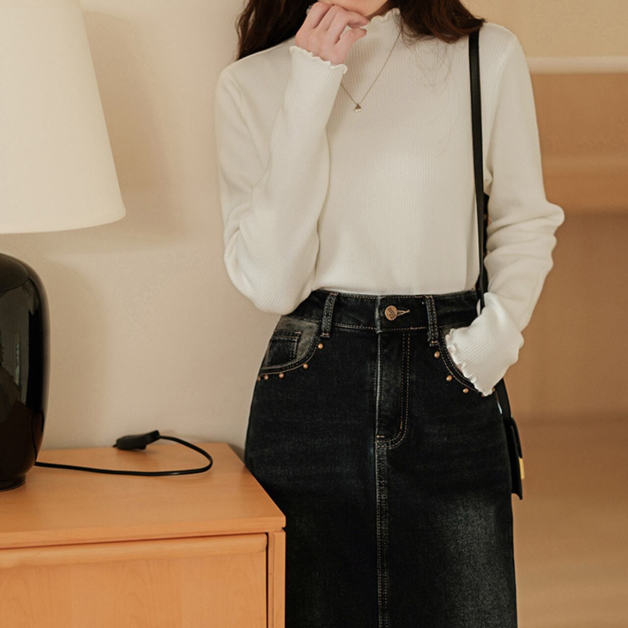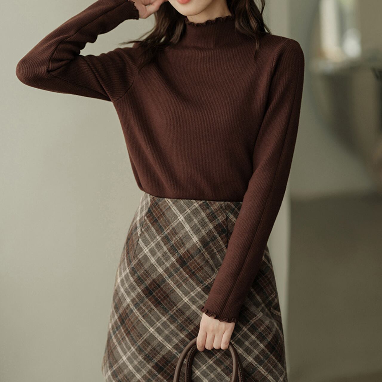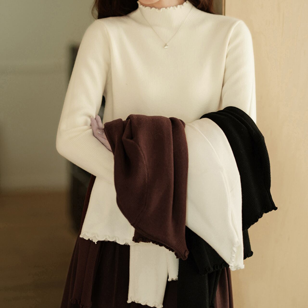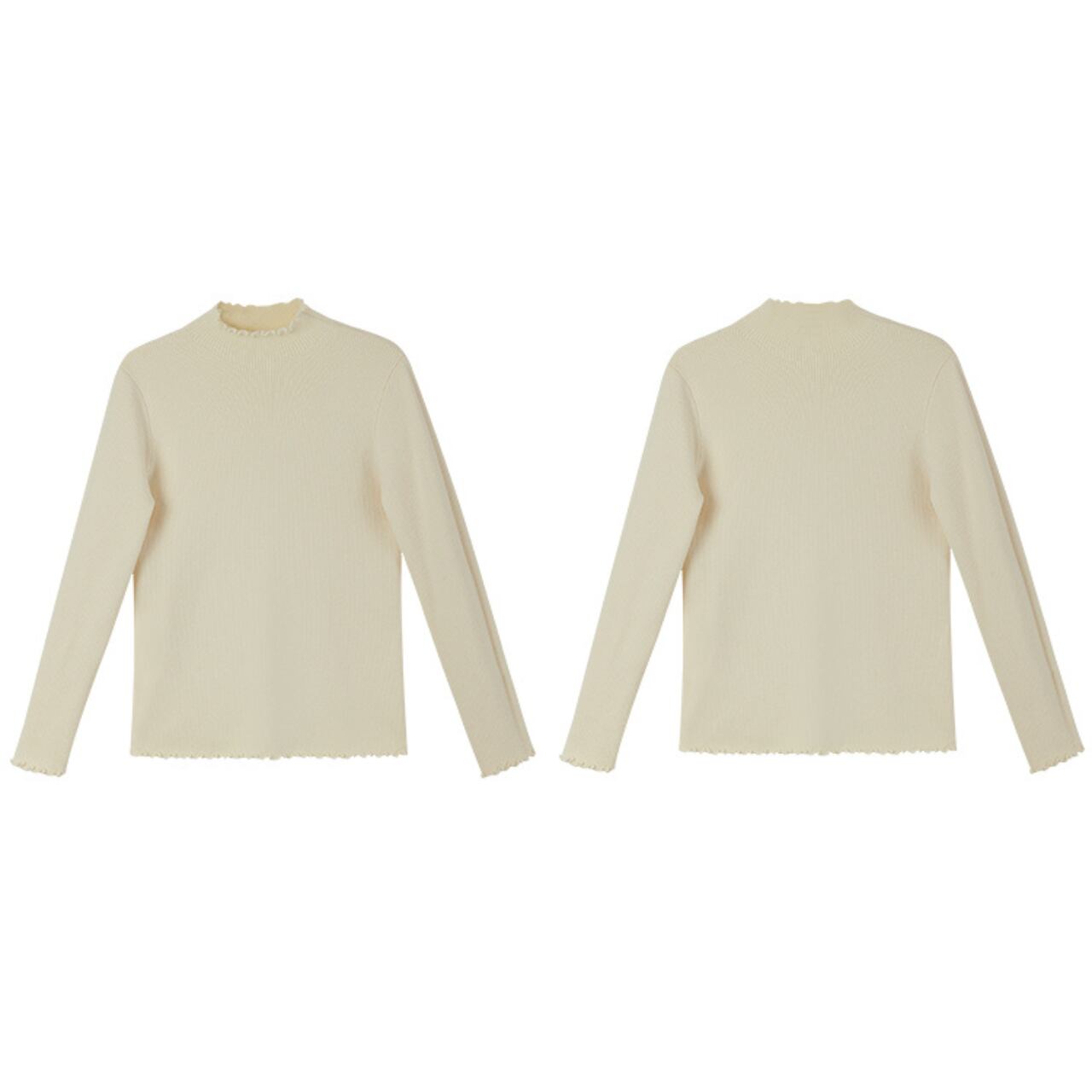 首元と袖口に小さなフリルをあしらったリブニットトップス。シンプルなデザインながら、女性らしいやわらかさを演出してくれます。伸縮性があり体に優しくフィットし、1枚でもインナーとしても着回しやすい万能アイテム。スカートと合わせてフェミニンに、デニムと合わせてカジュアルにと、幅広く楽しめる一枚です。