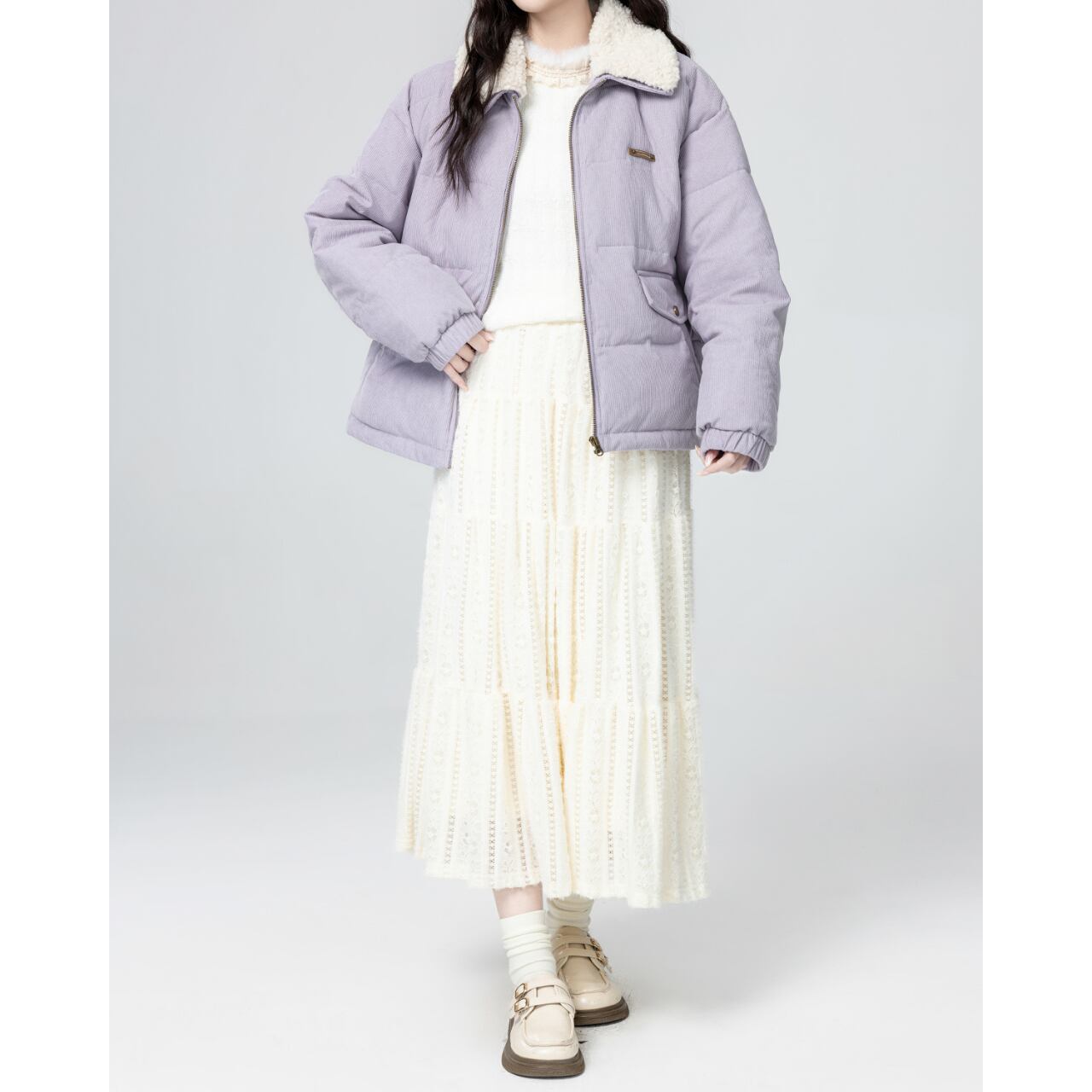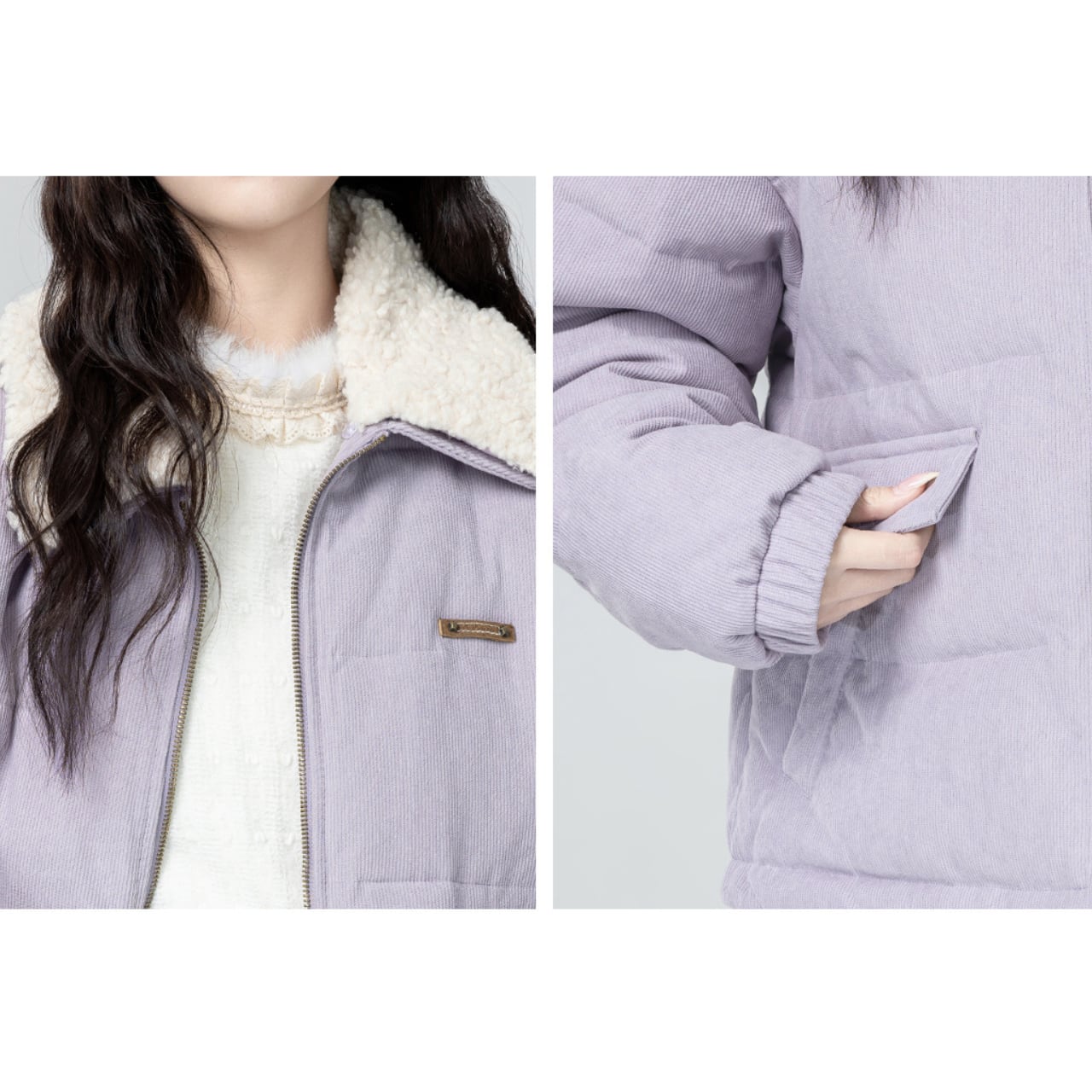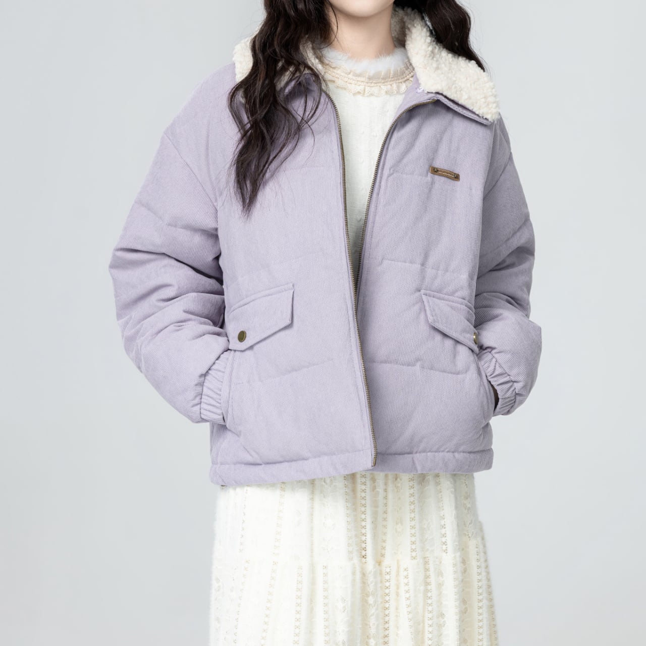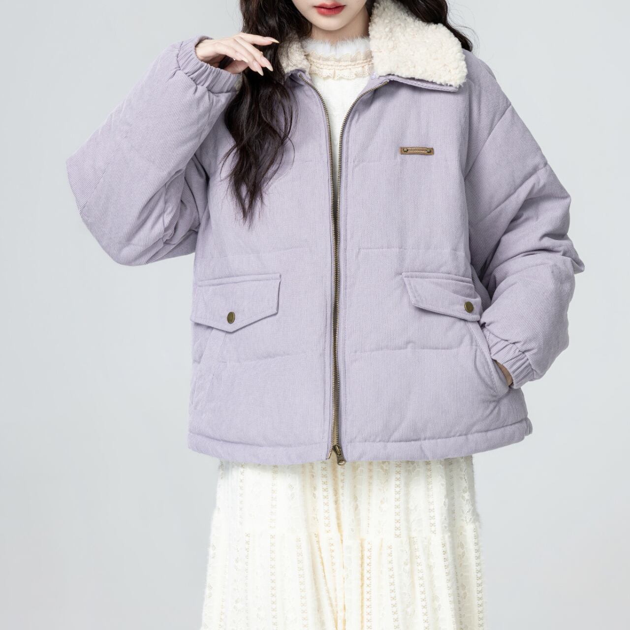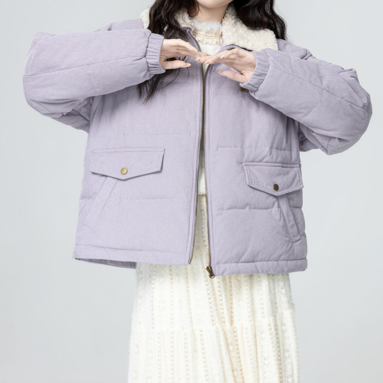 淡いラベンダーの色味がやさしく映える中綿ジャケット。