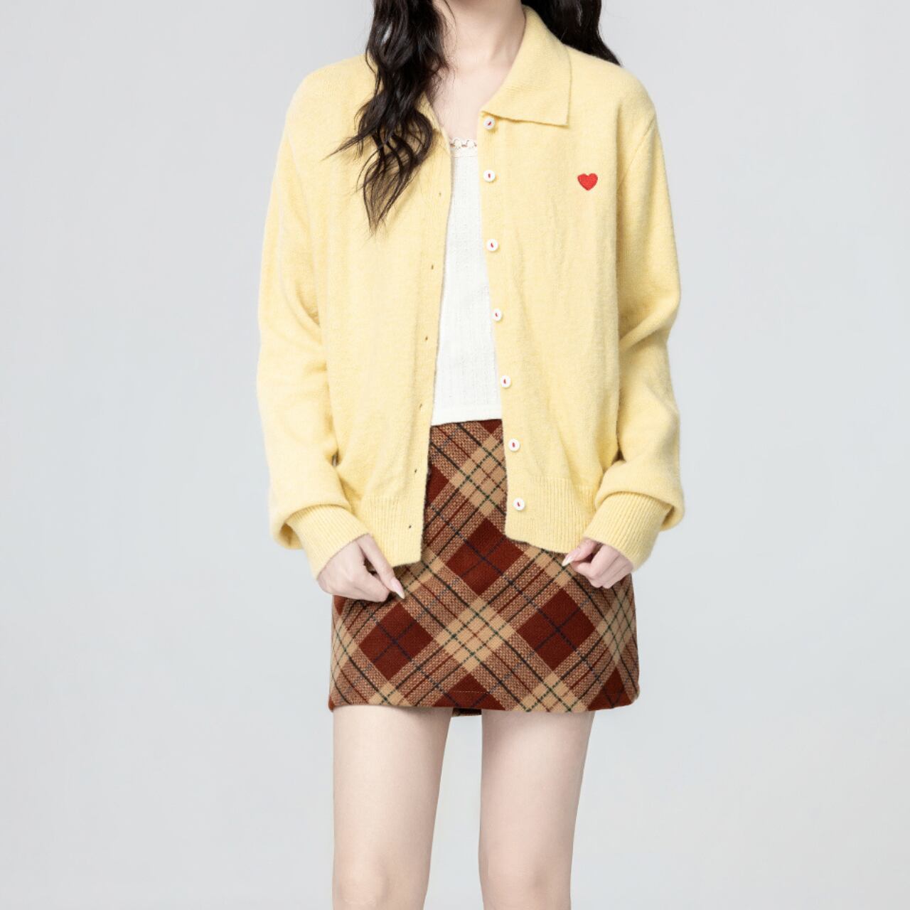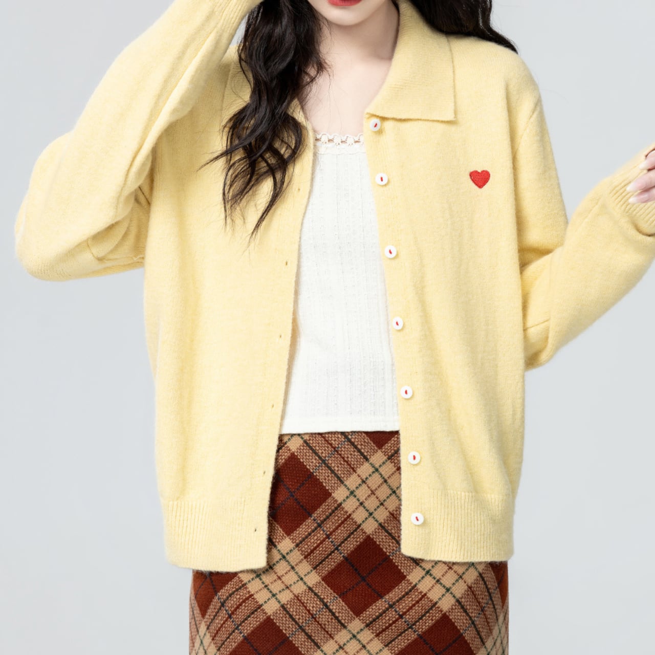 やわらかなパステルイエローに、胸元の小さなハート刺繍がアクセントのカーディガン。