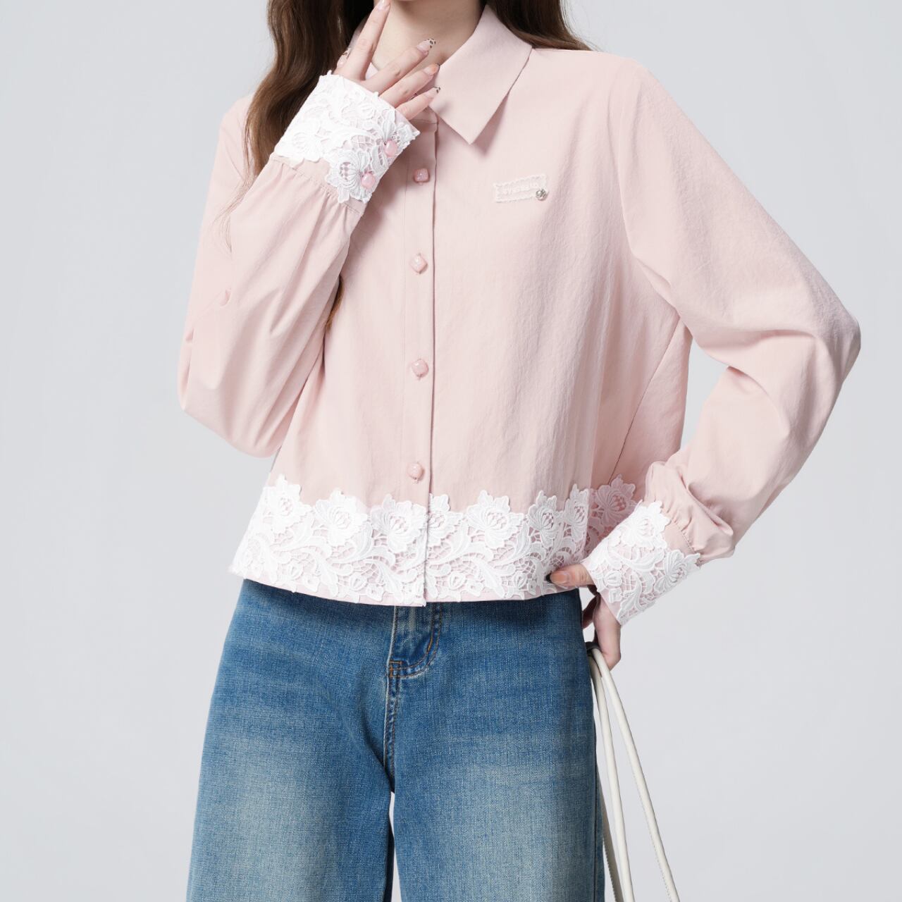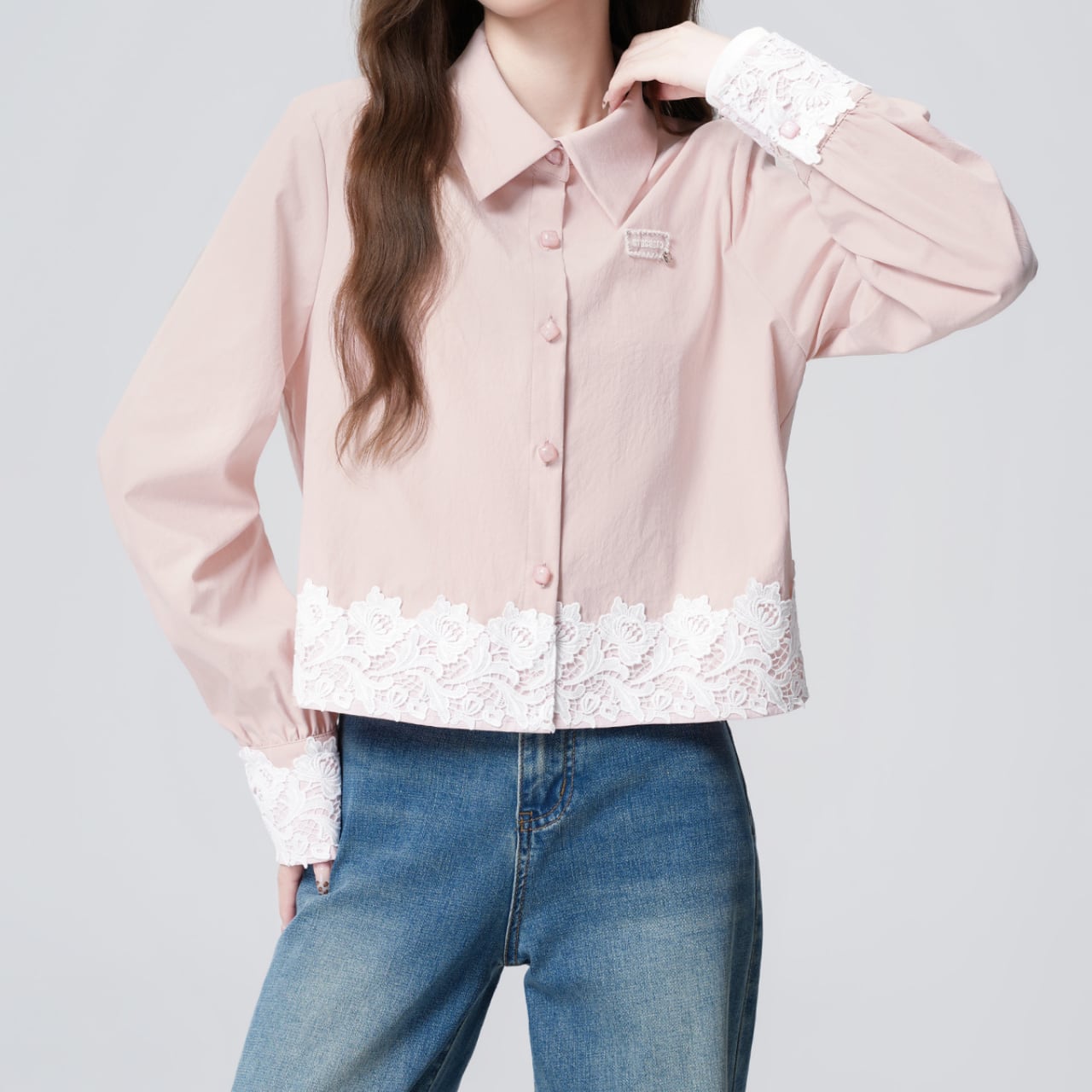 裾と袖口にあしらわれた繊細なレースがポイントのブラウスジャケット。