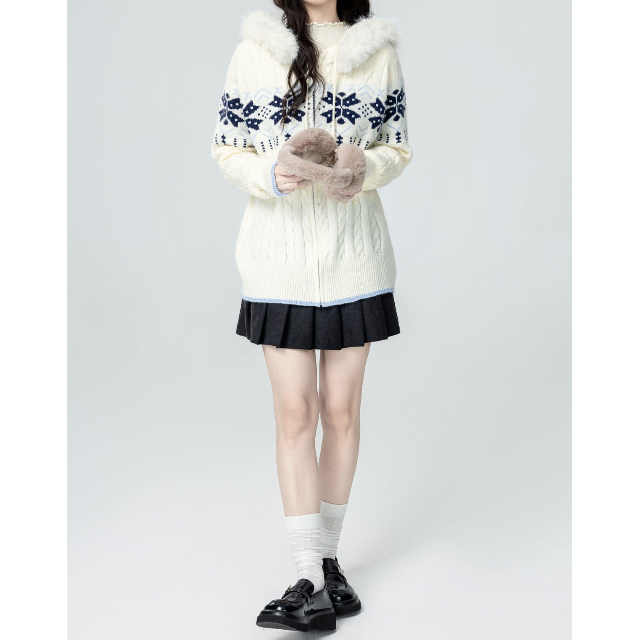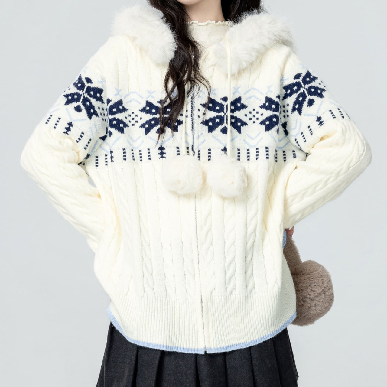 やわらかなケーブル編みにノルディック柄をあしらったフェミニンニットパーカー。